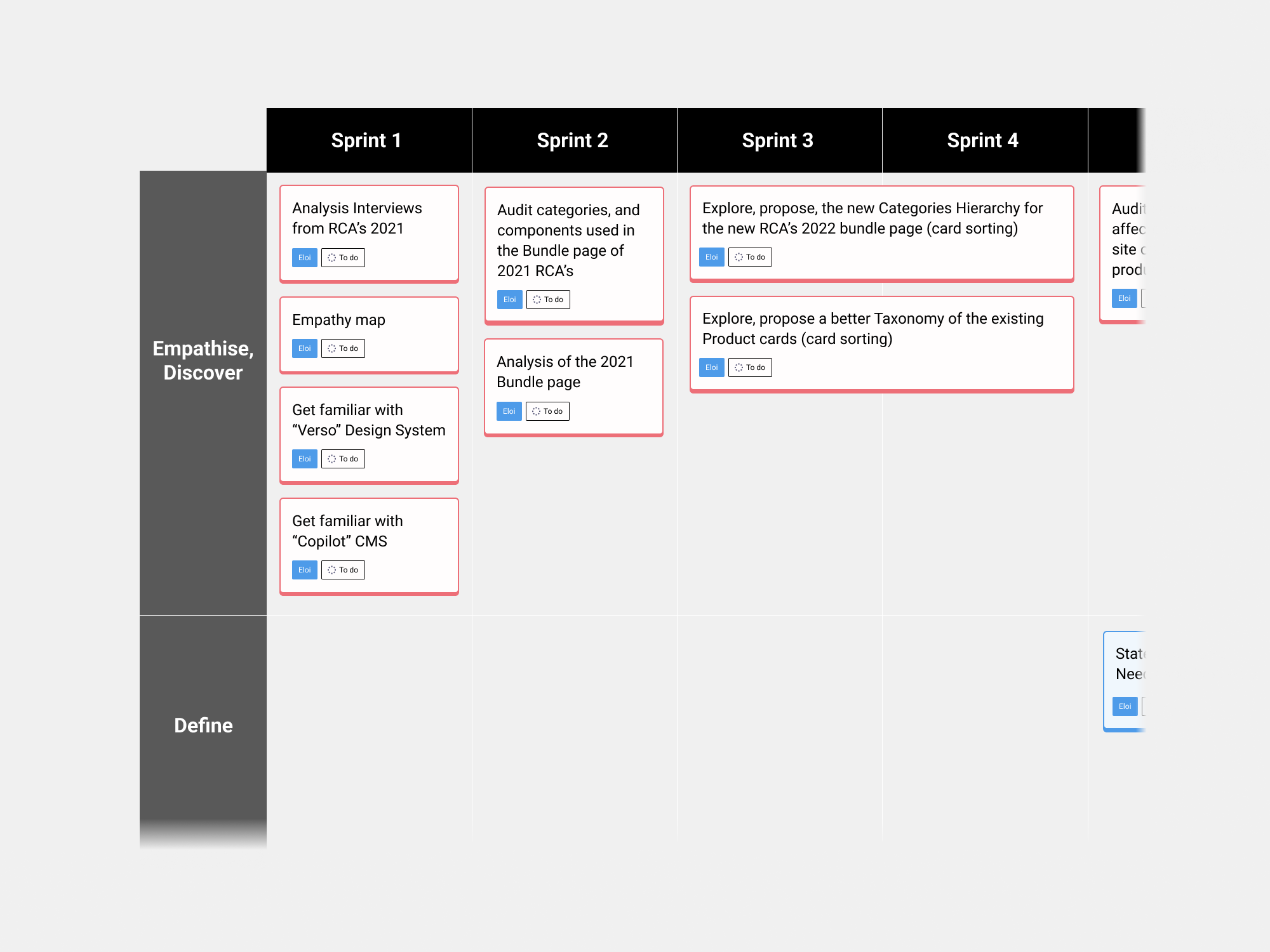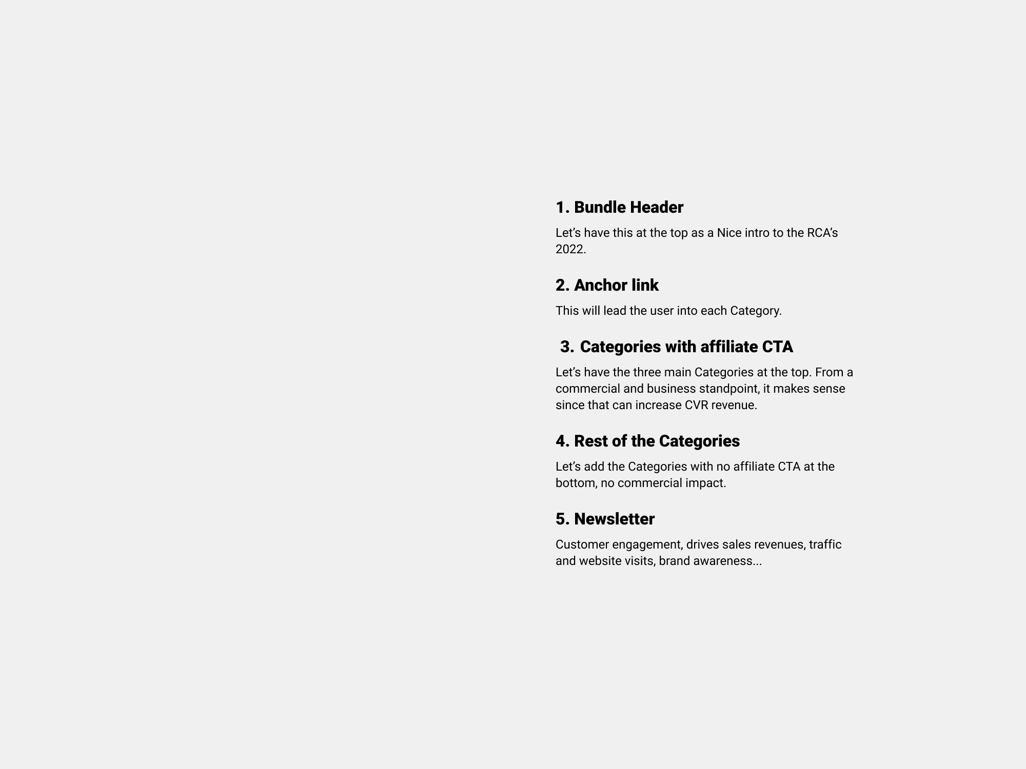 • Audit categories RCAs Bundle page : I conducted an audit of the bundle page, examining the number of categories, flows, and variations. The goal was to understand what went wrong in the previous years, identify potential changes, and start to devise ideas based on this information.