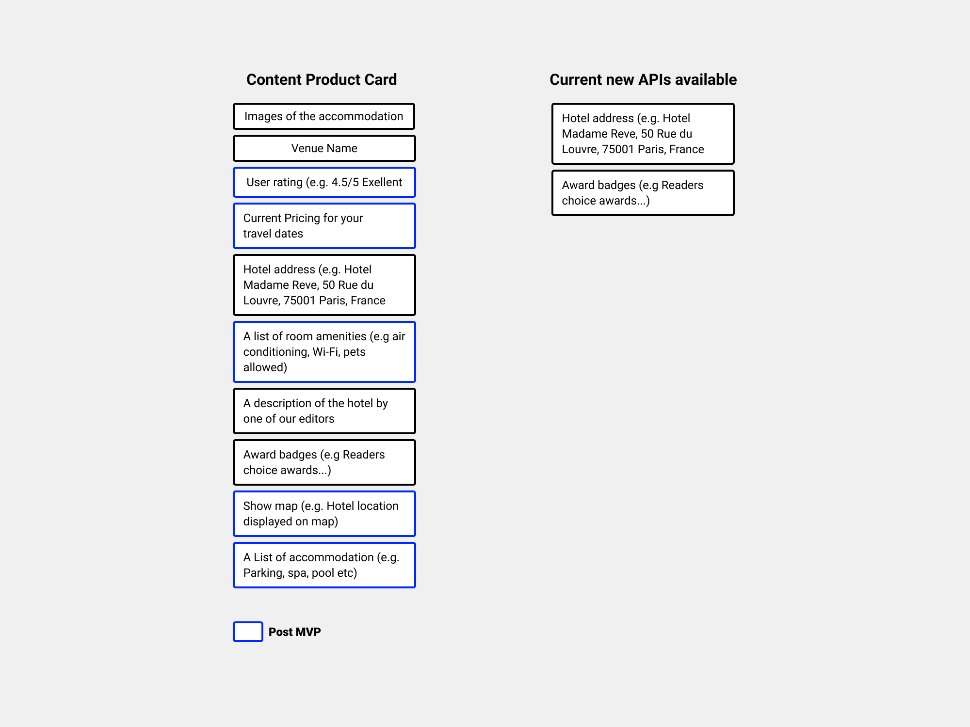 Let’s narrow down what we need for the new product cards, MVP content, and current new APIs available.