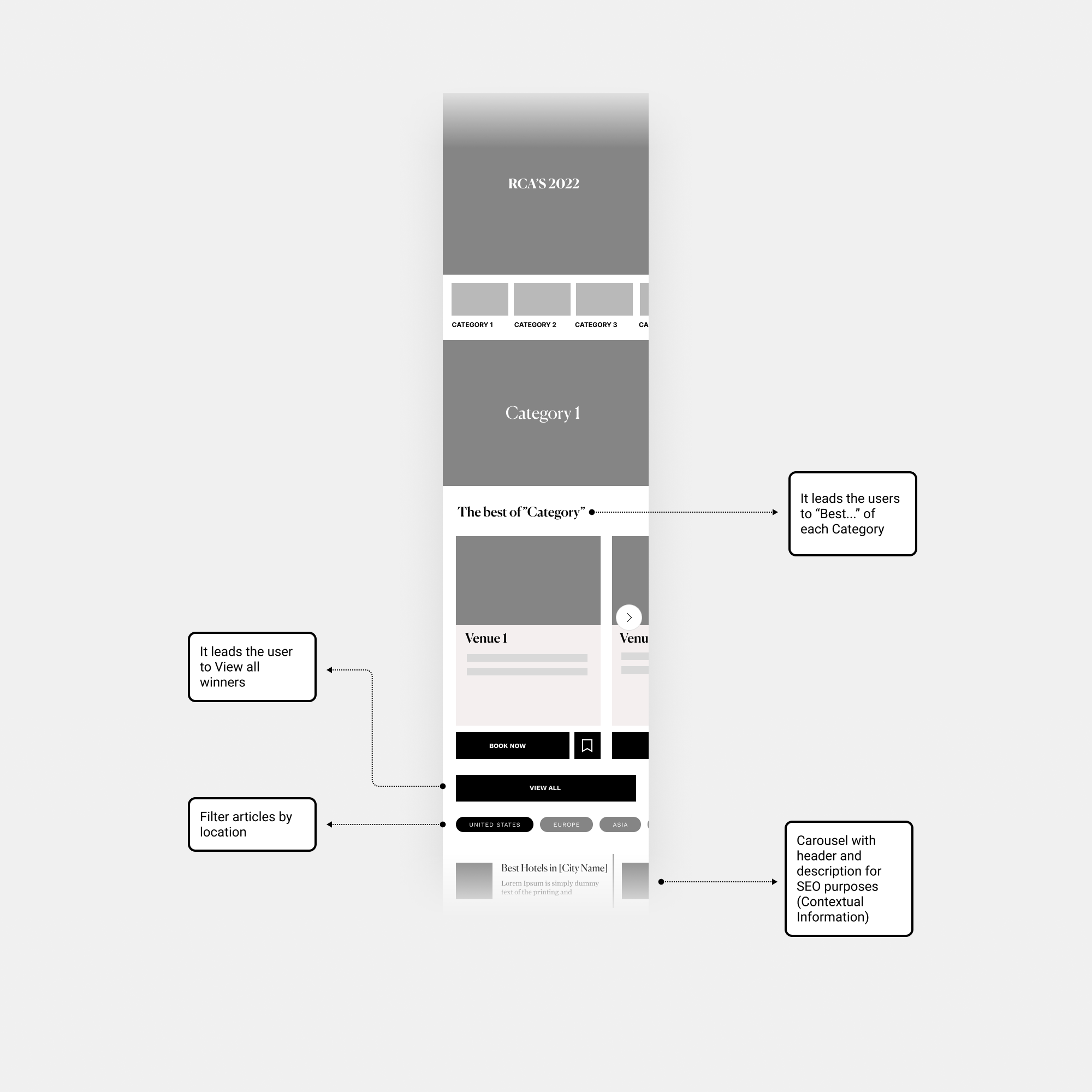 Needs: Navigate across categories, explore the best 2022 “Categories” and “save” and book a venue.