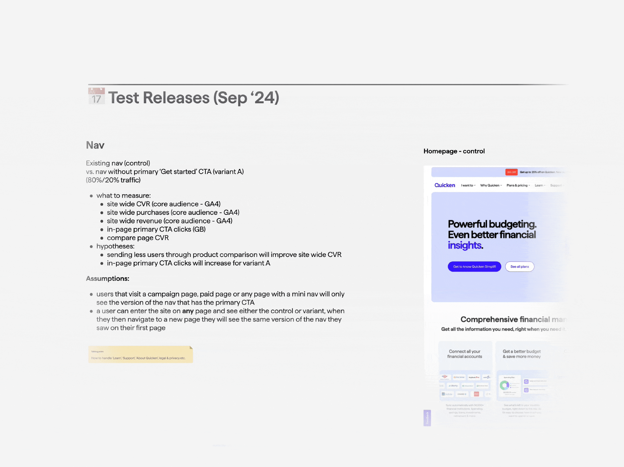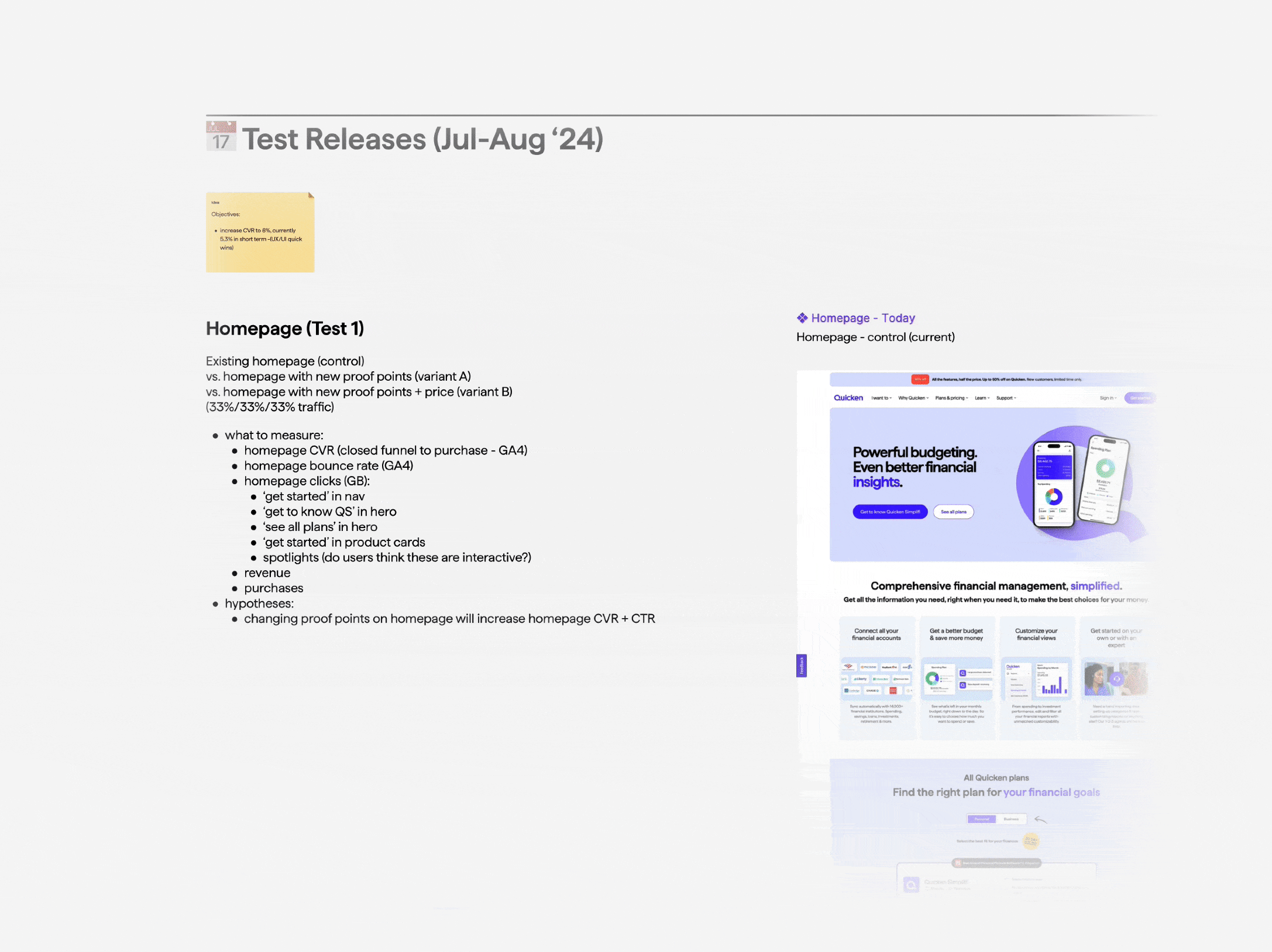 To achieve quick wins, we created a test release plan for July-August 2024 and another for September 2024. I collaborated with the design lead on the Homepage and Simplifi product pages, as Glassbox data identified these pages as poor performers, with the Homepage being the root of the poor performance.