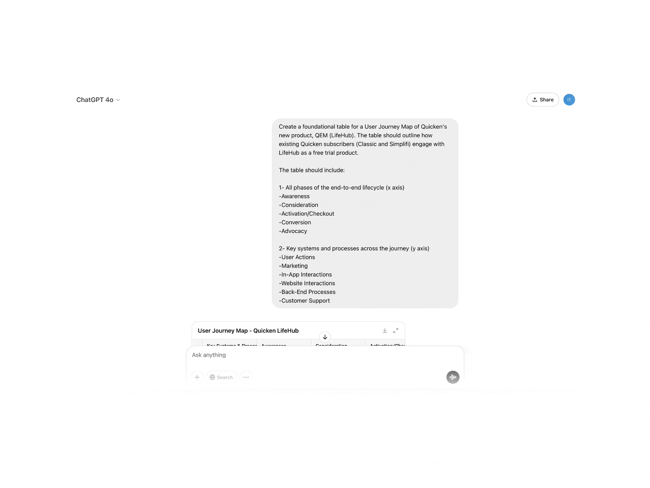 • I used ChatGPT to outline user journey stages for a new PFM product, refining them with the PM. Without a Miro account, I built the framework in FigJam.