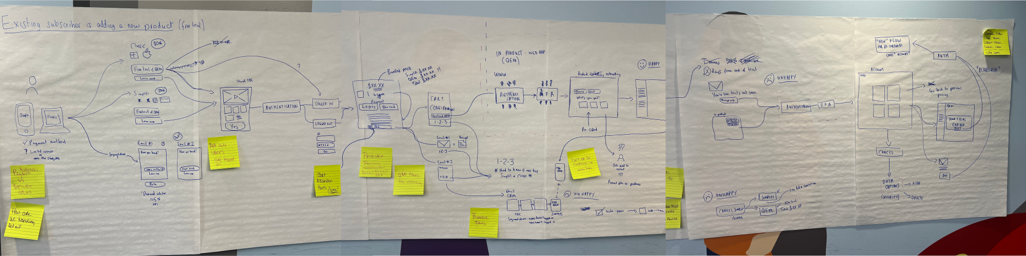 When I joined the company, the Design Lead and the PM had already set this up. They ran a high level workshop to map out the end-to-end flow for existing subscribers adding a new product -LifeHub (Free Trial). This is a rough outline of the flow.