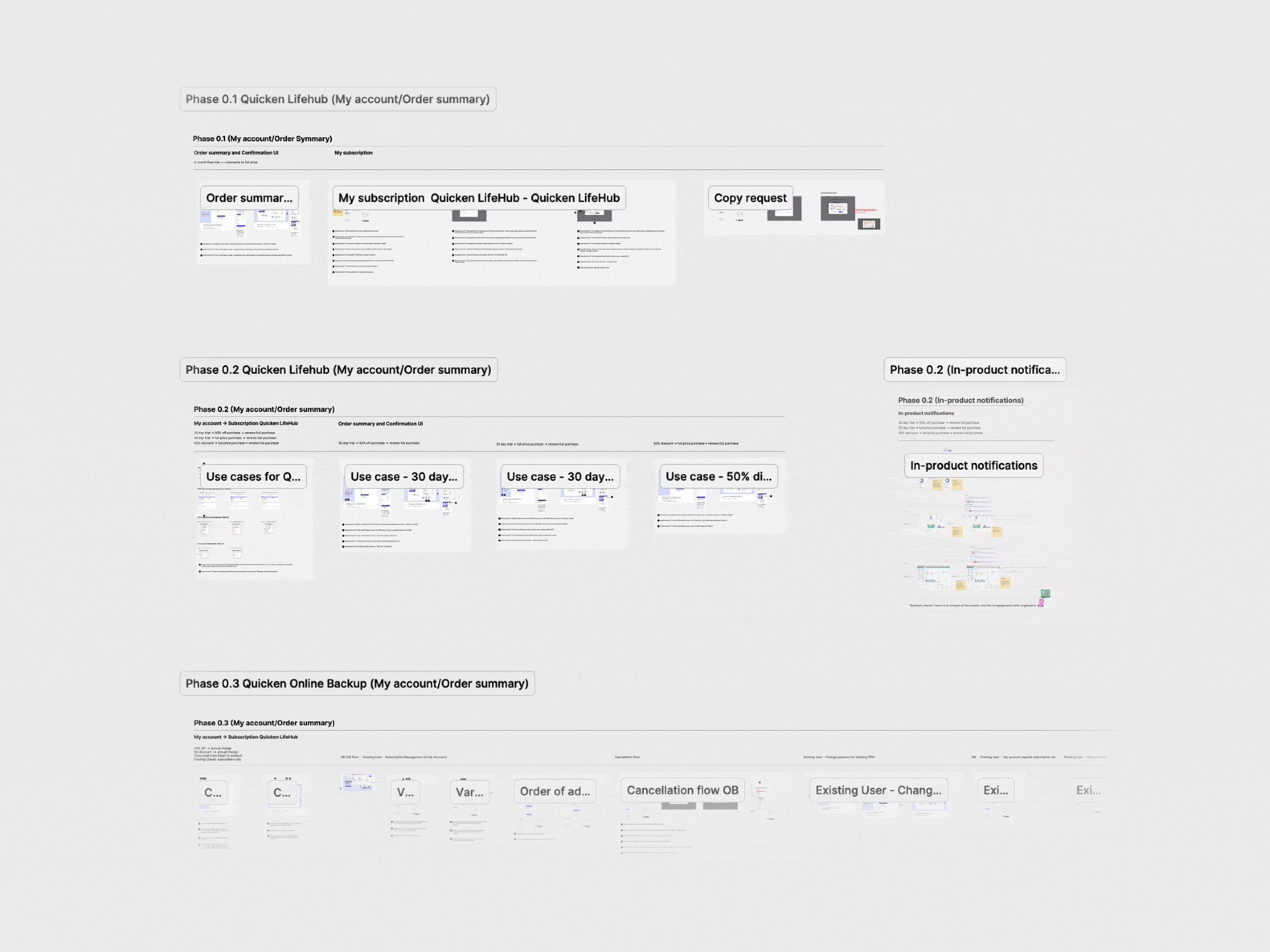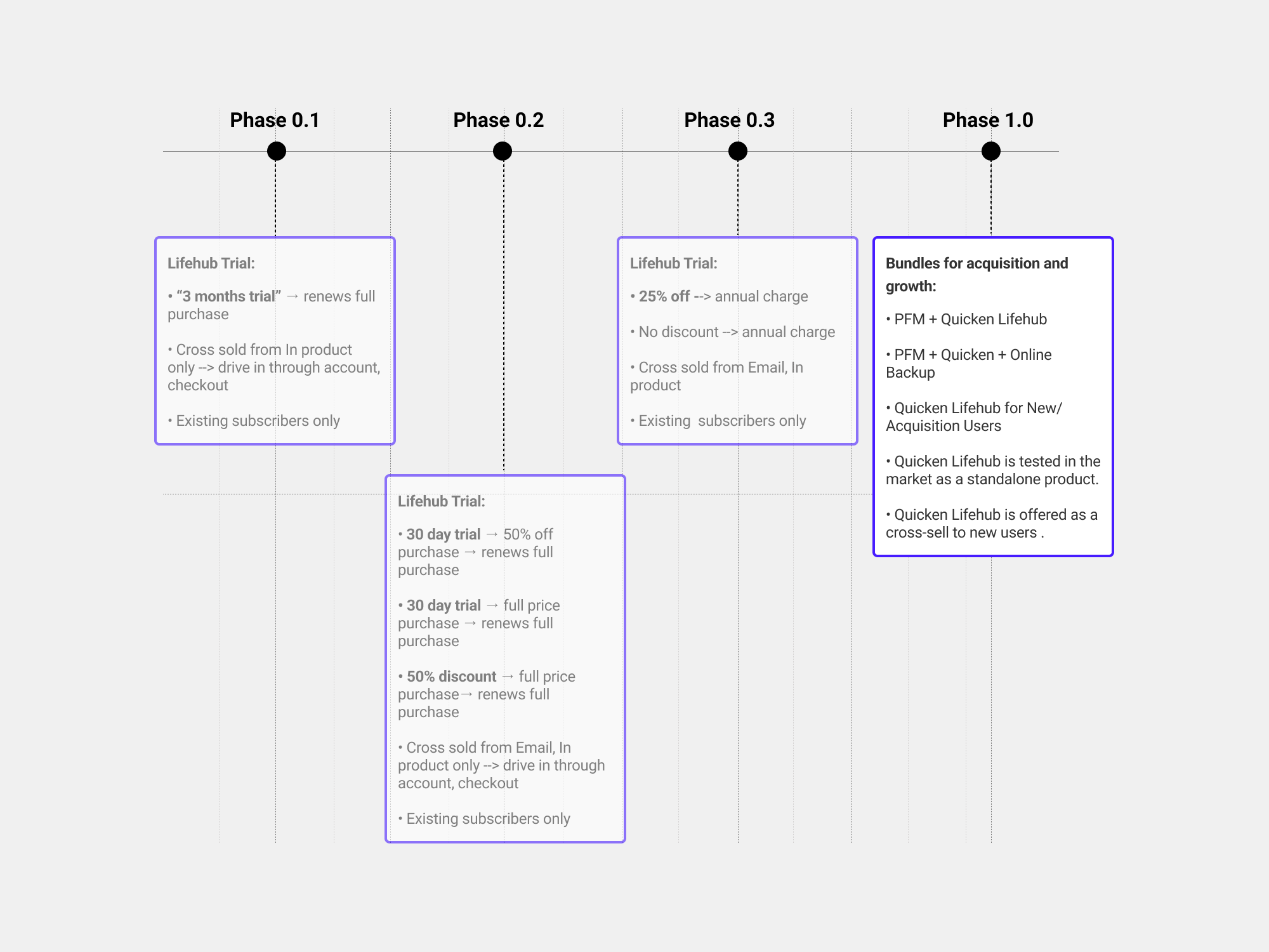 After focusing on trial sales, we were now positioning Quicken Lifehub as a standalone product under a new subscription model (PHASE 1.0). This exercise aimed to validate user journeys for testing, not build the Lifehub page, while also introducing new product bundles and ensuring scalability.