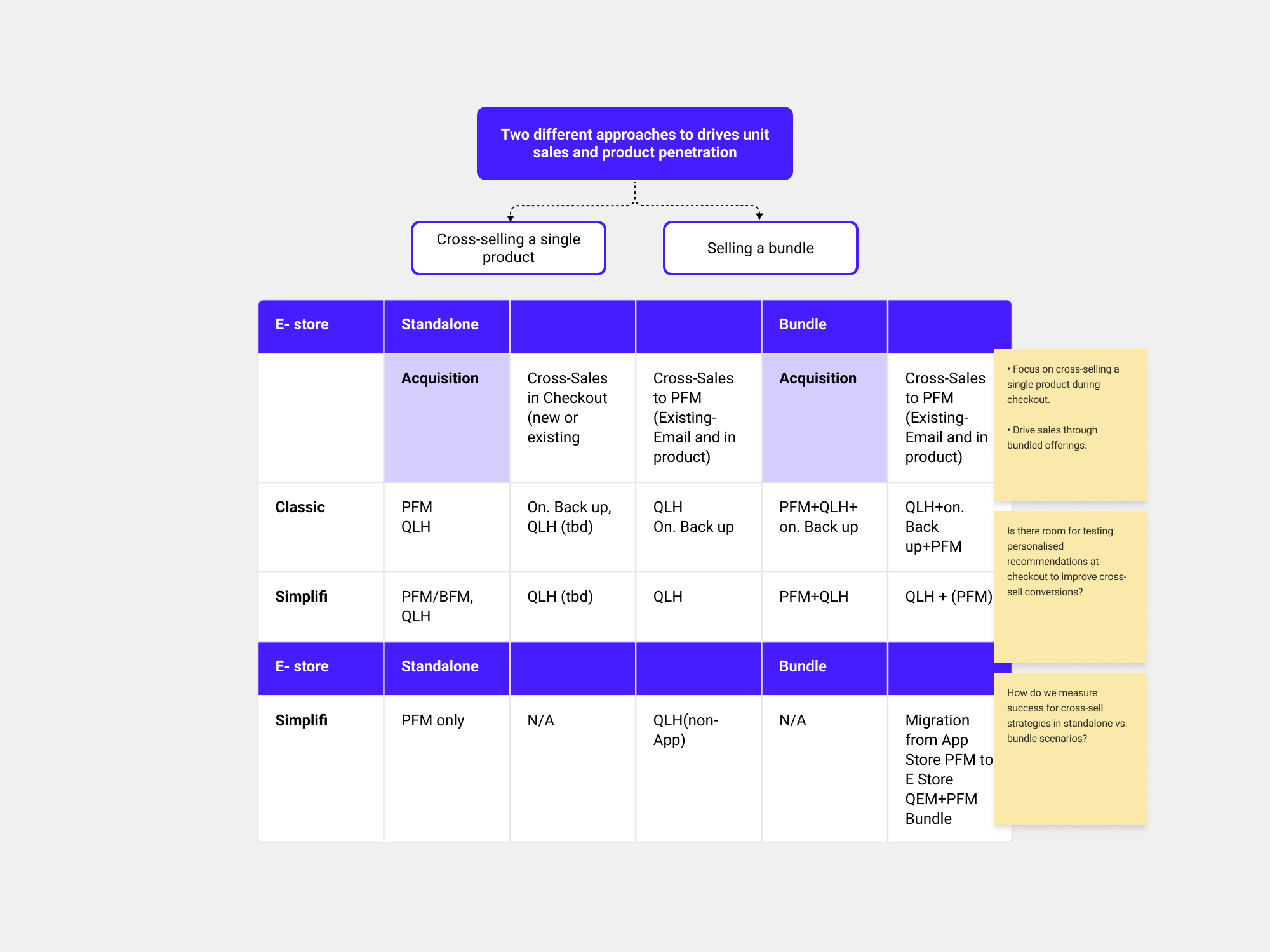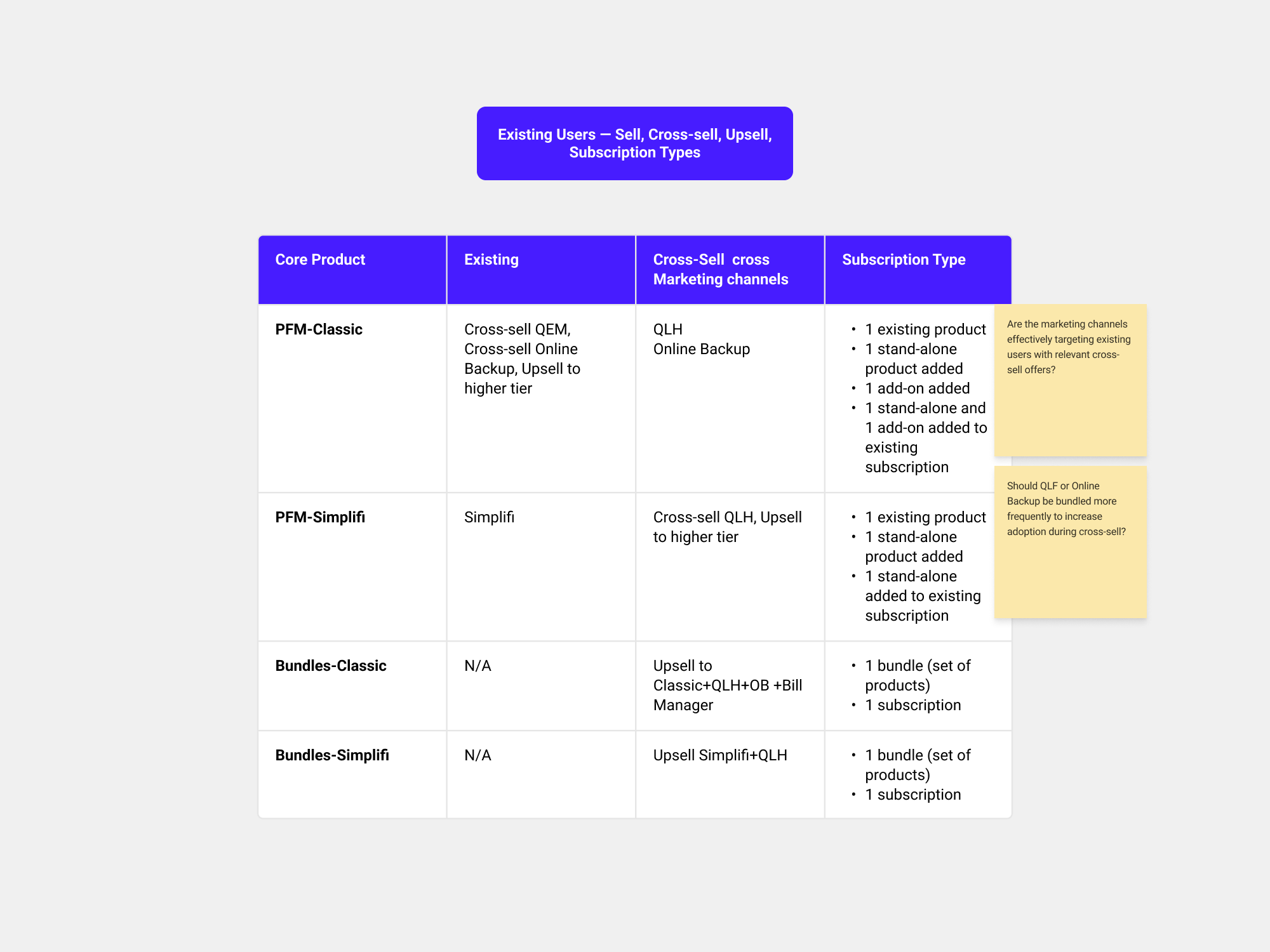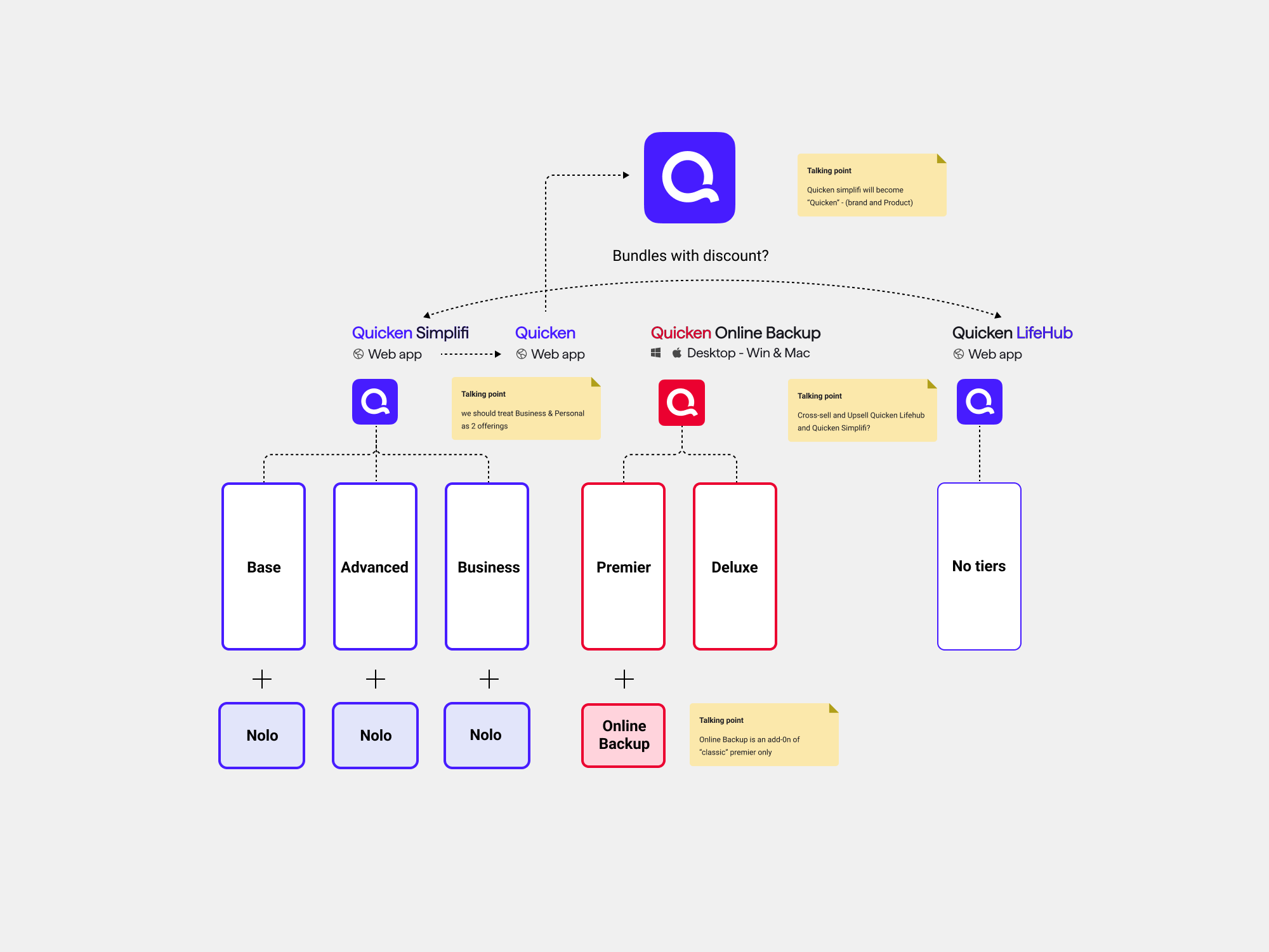 As a business, we planned to cross-sell or up-sell Online Backup at various site touchpoints—or offer it in a bundle. Simplifi, Classic, and QEM (Quicken Lifehub) would remain standalone products; however, we also considered the potential to bundle Simplifi with Lifehub or Classic with Lifehub.