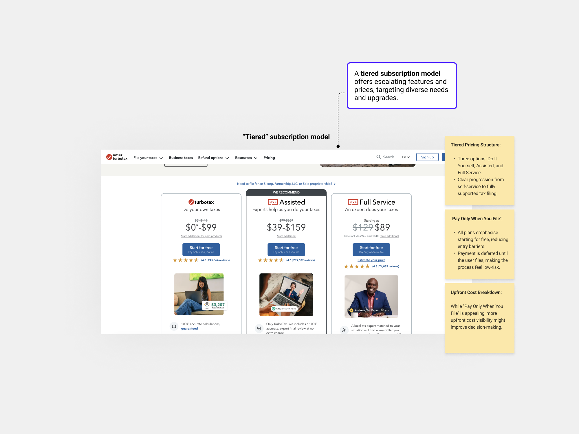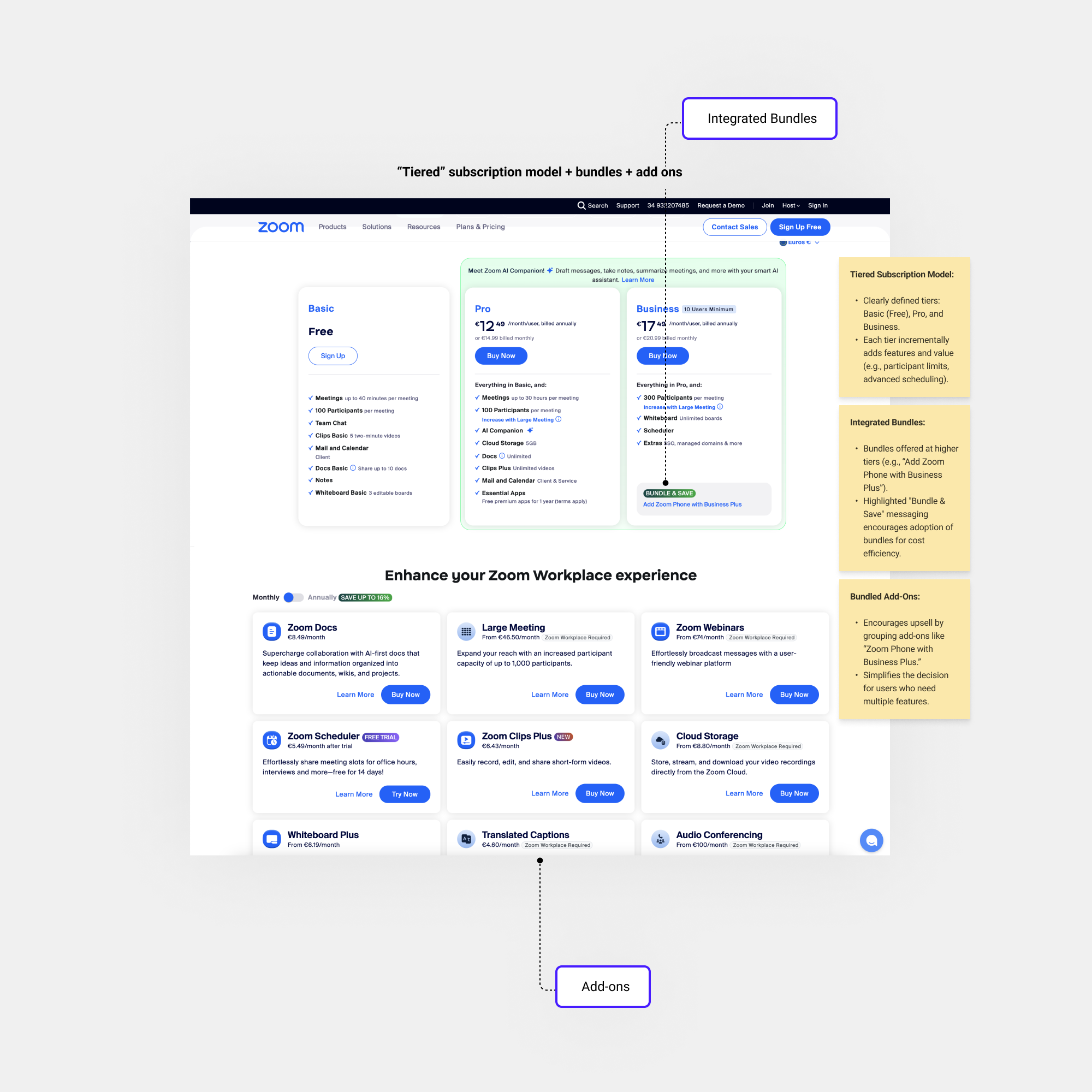 Given our goals, a tiered subscription model with bundles and add-ons was ideal, allowing: