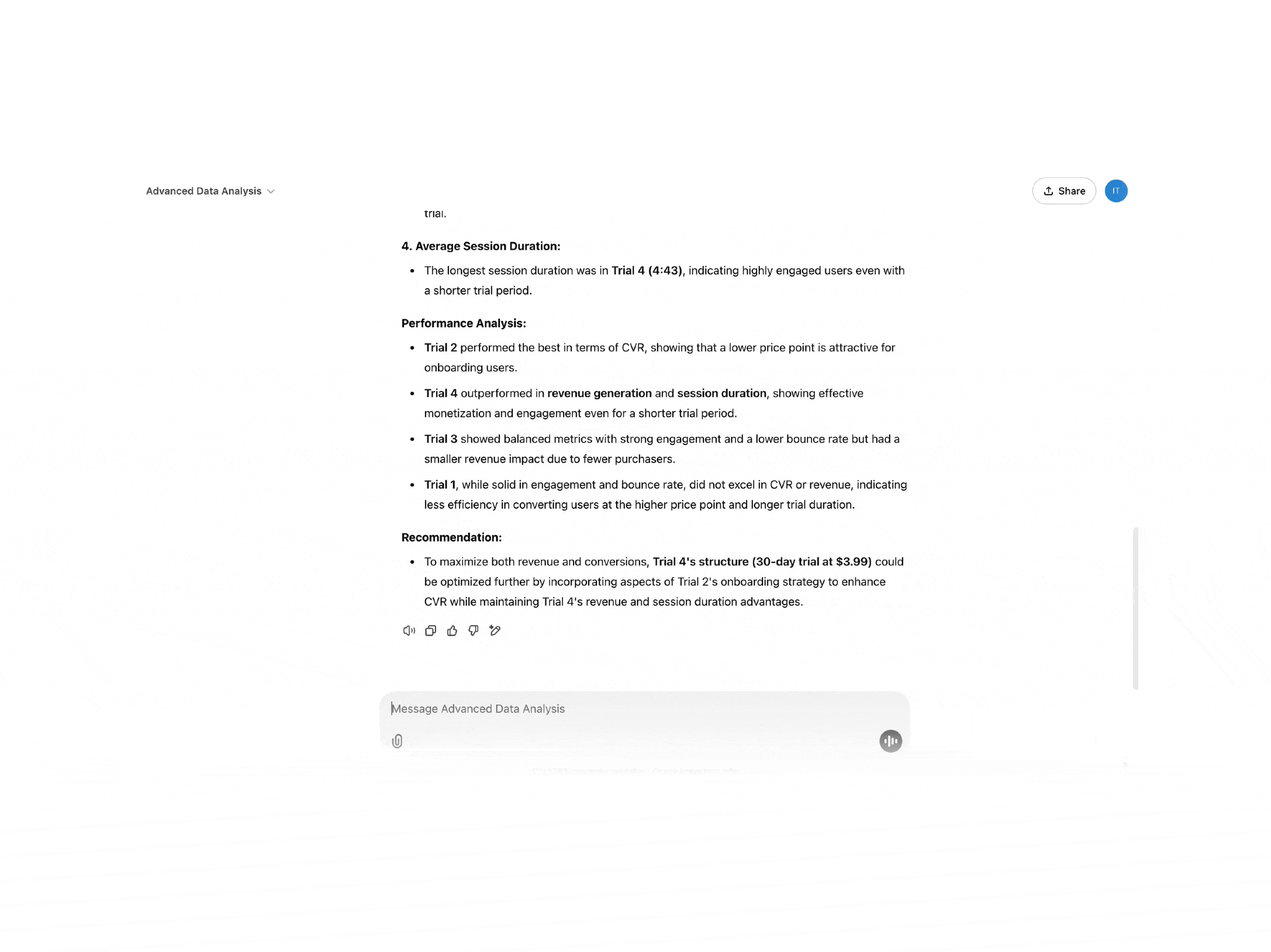 We had our analytics team ready to evaluate the results of the four different trials, supported by the Quicken GA dashboard. At the same time, we were curious to explore ChatGPT's "Advanced Data Analysis" (ADA) feature to assess its accuracy compared to human analysis.