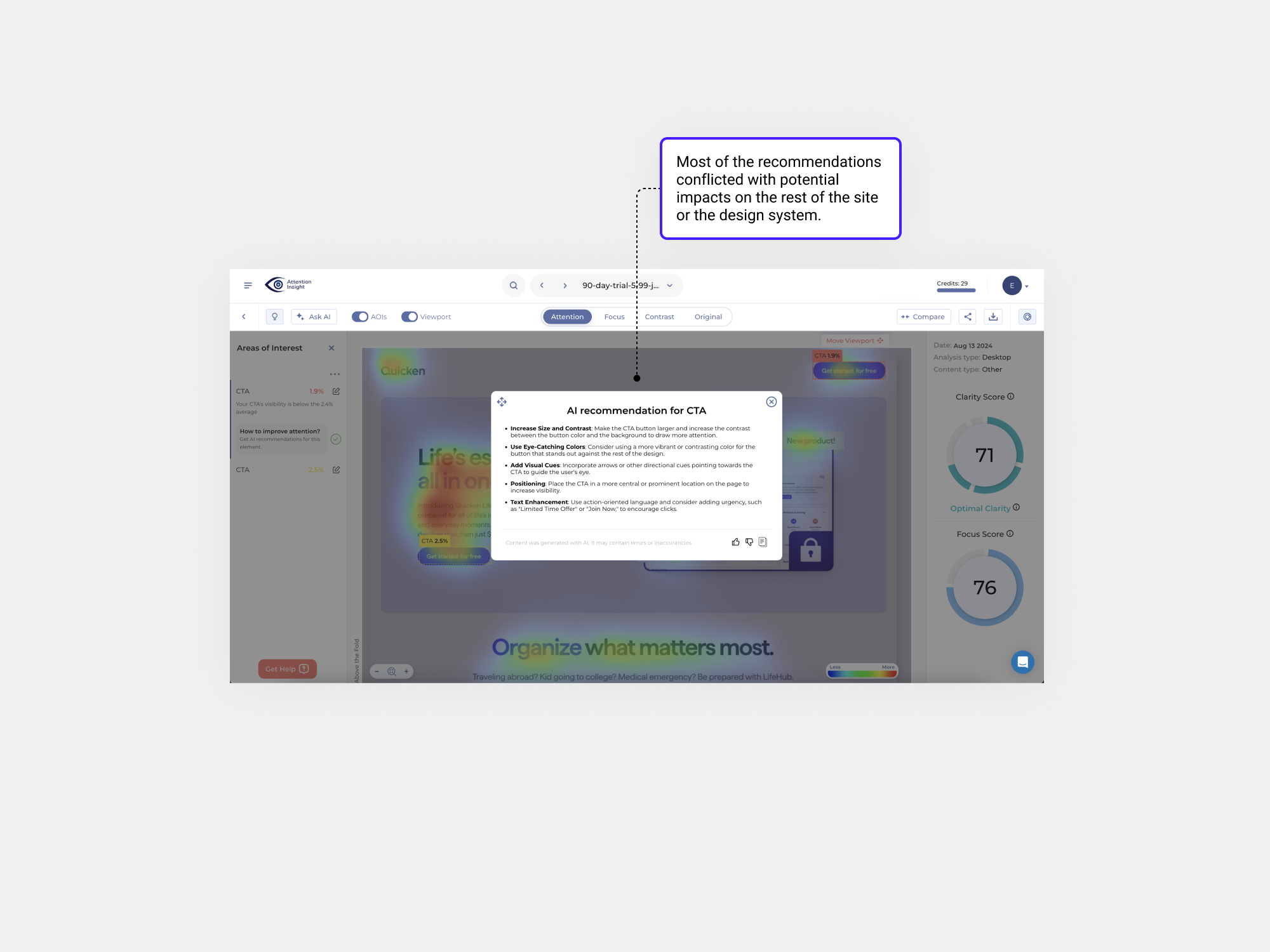 • To evaluate how consumers would engage with the designs before launch, I used a Figma AI plugin called Attention Insight. This tool provided valuable insights to validate my concepts for performance during the design stage with AI-generated attention analytics, complementing feedback gathered from iterations with various departments.