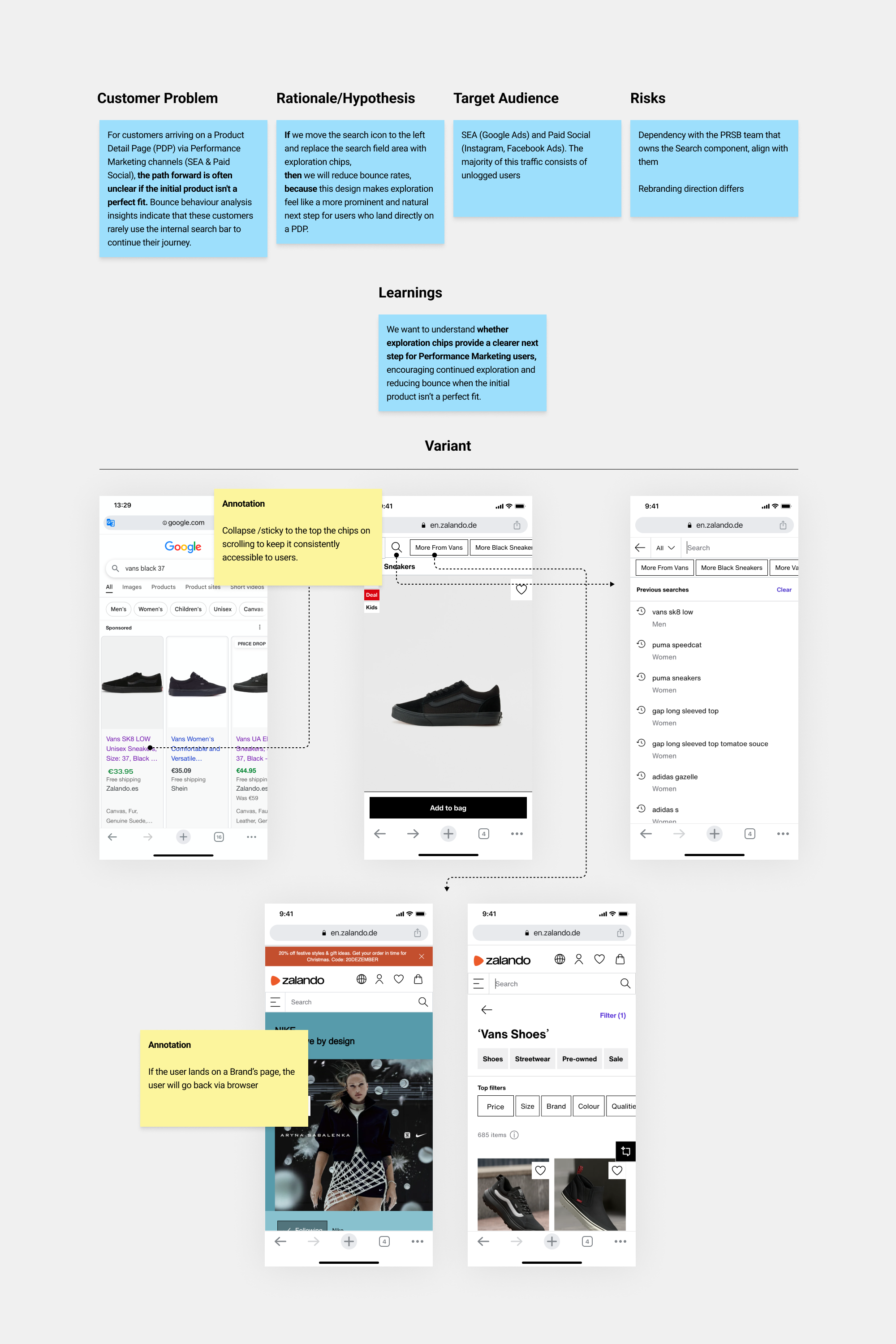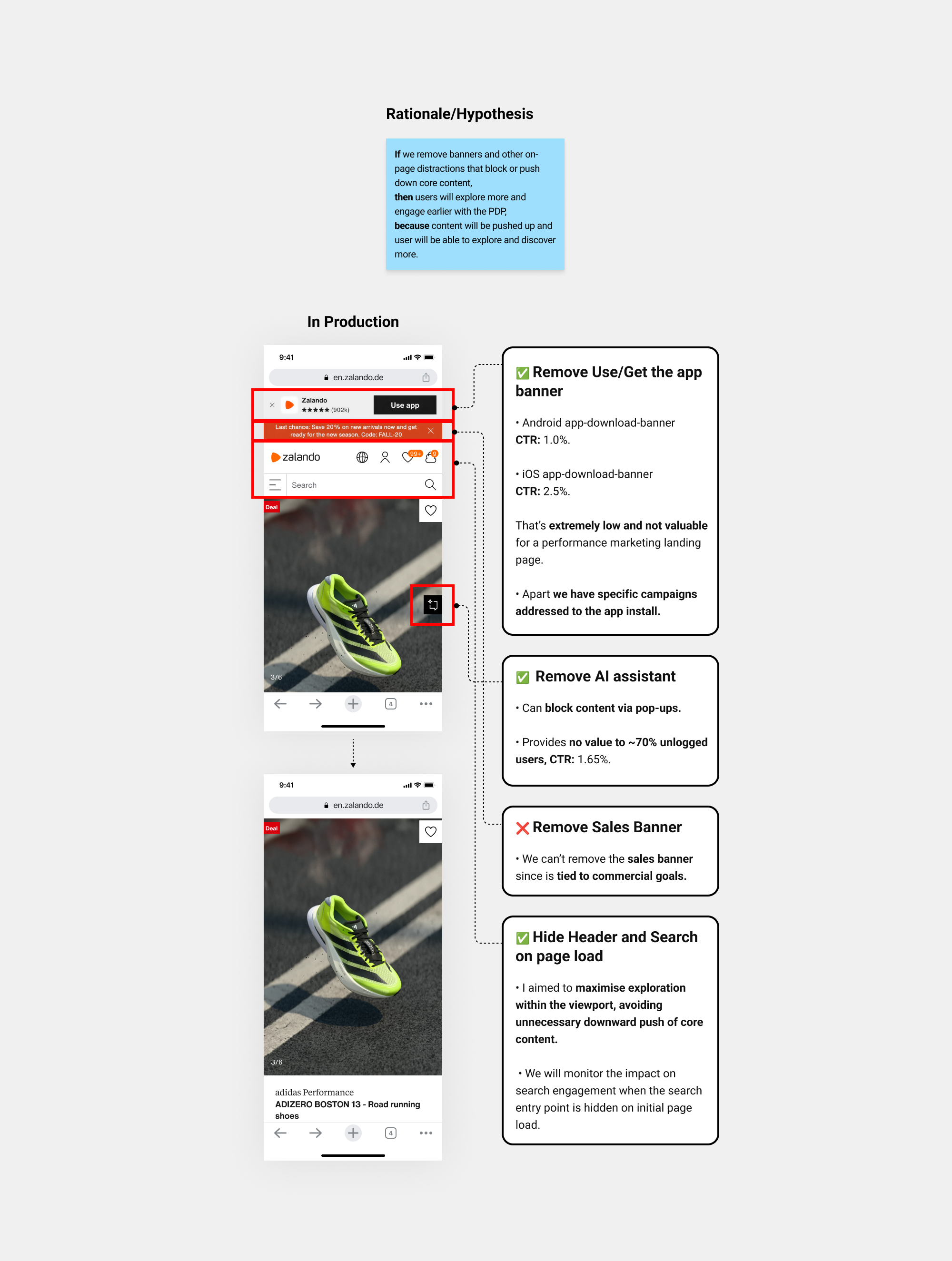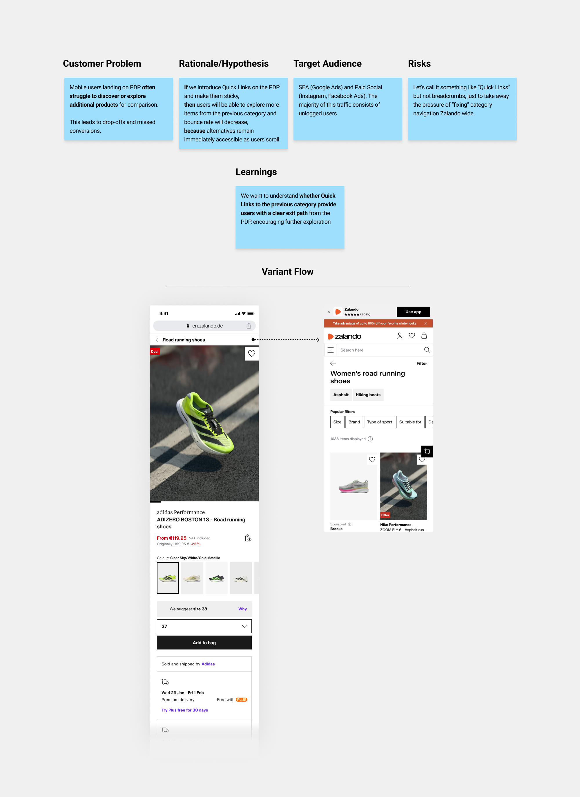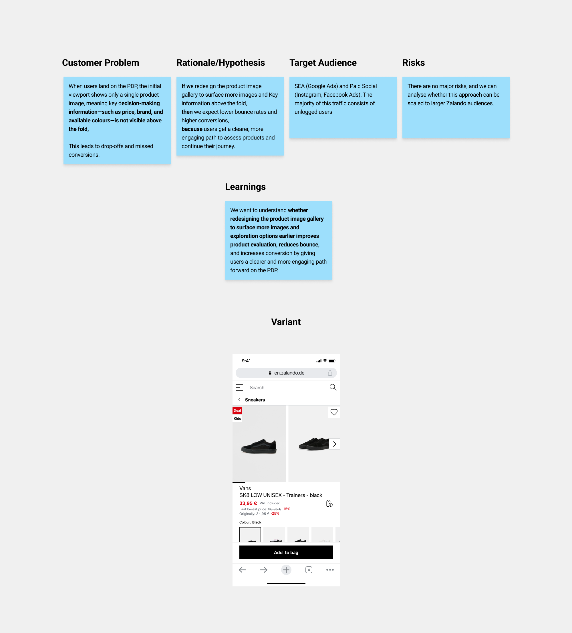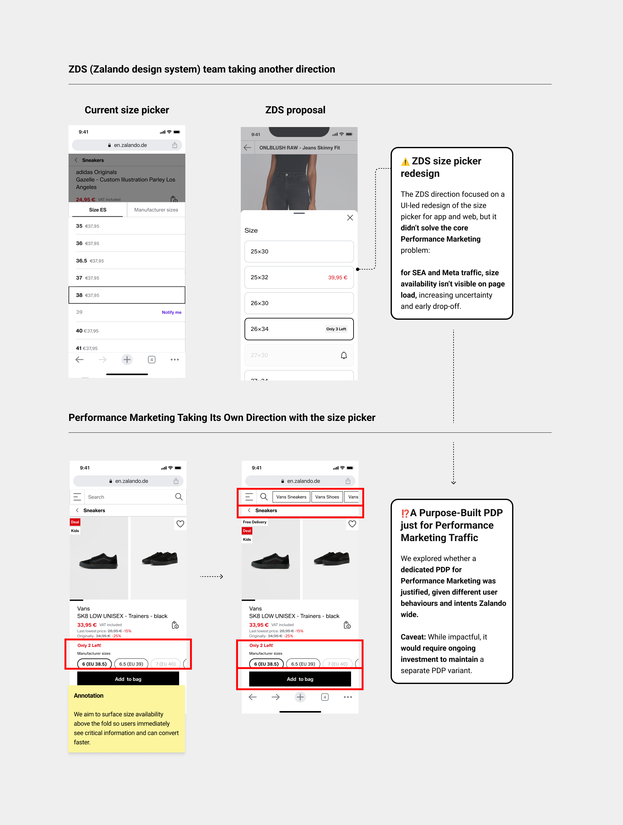 I optimised the PDP as a system, assessing scalable solutions for Performance Marketing and their potential to scale to the wider Zalando audience.
