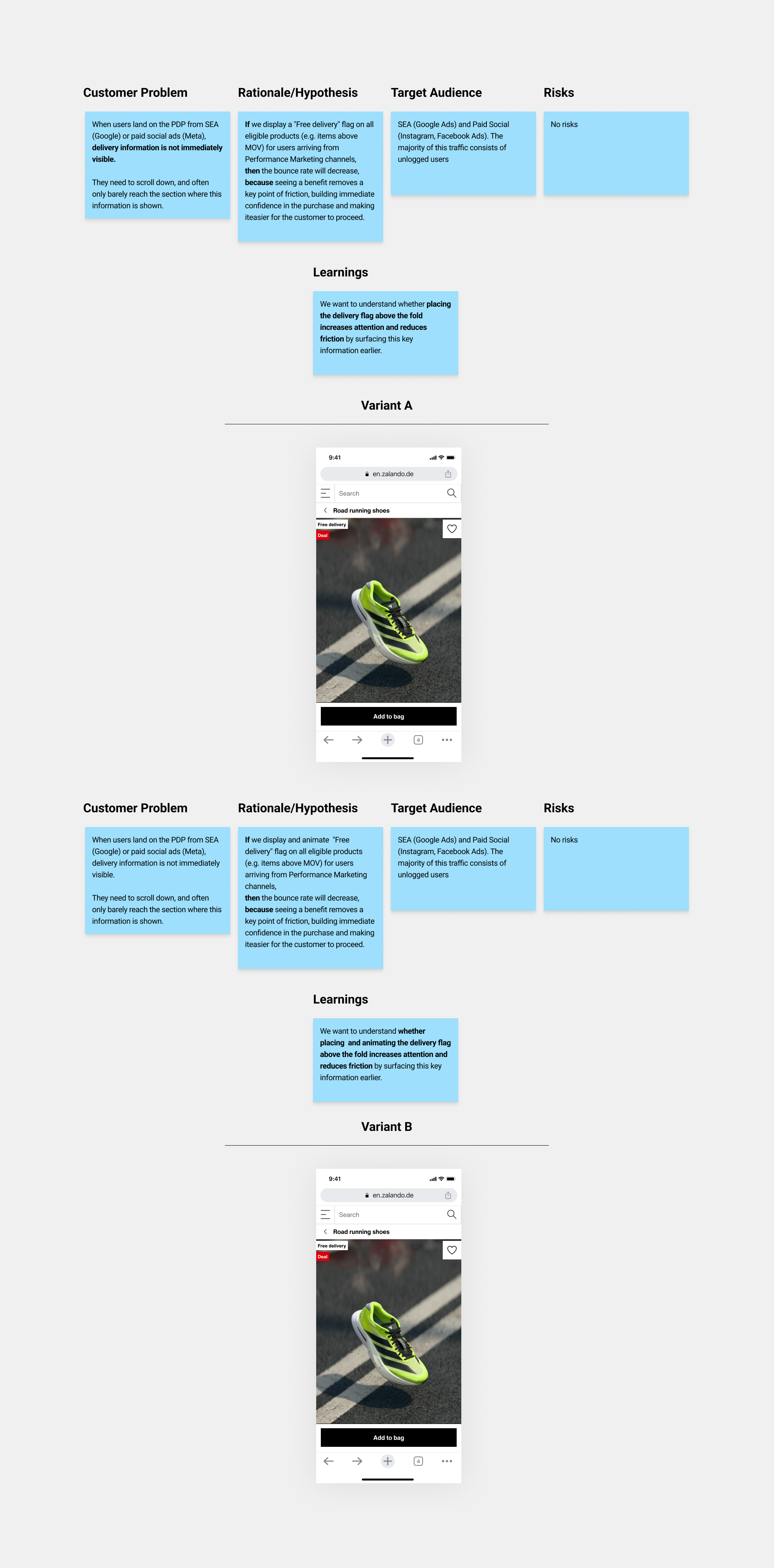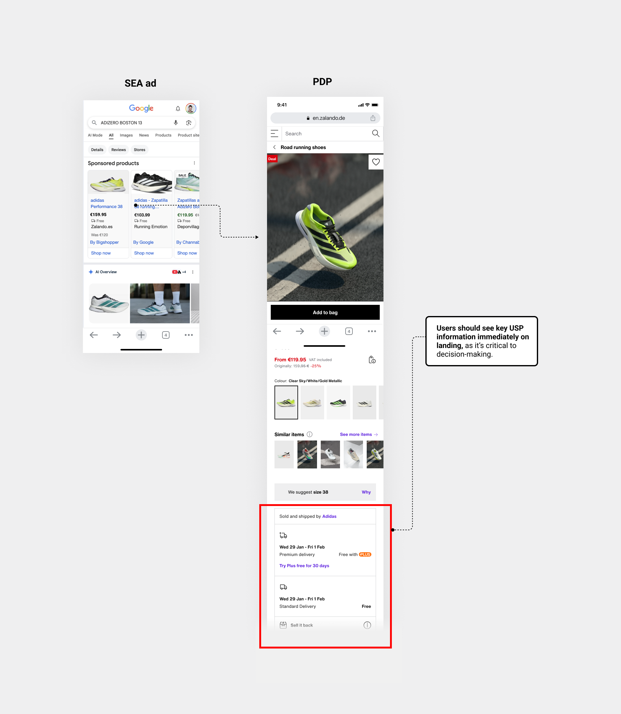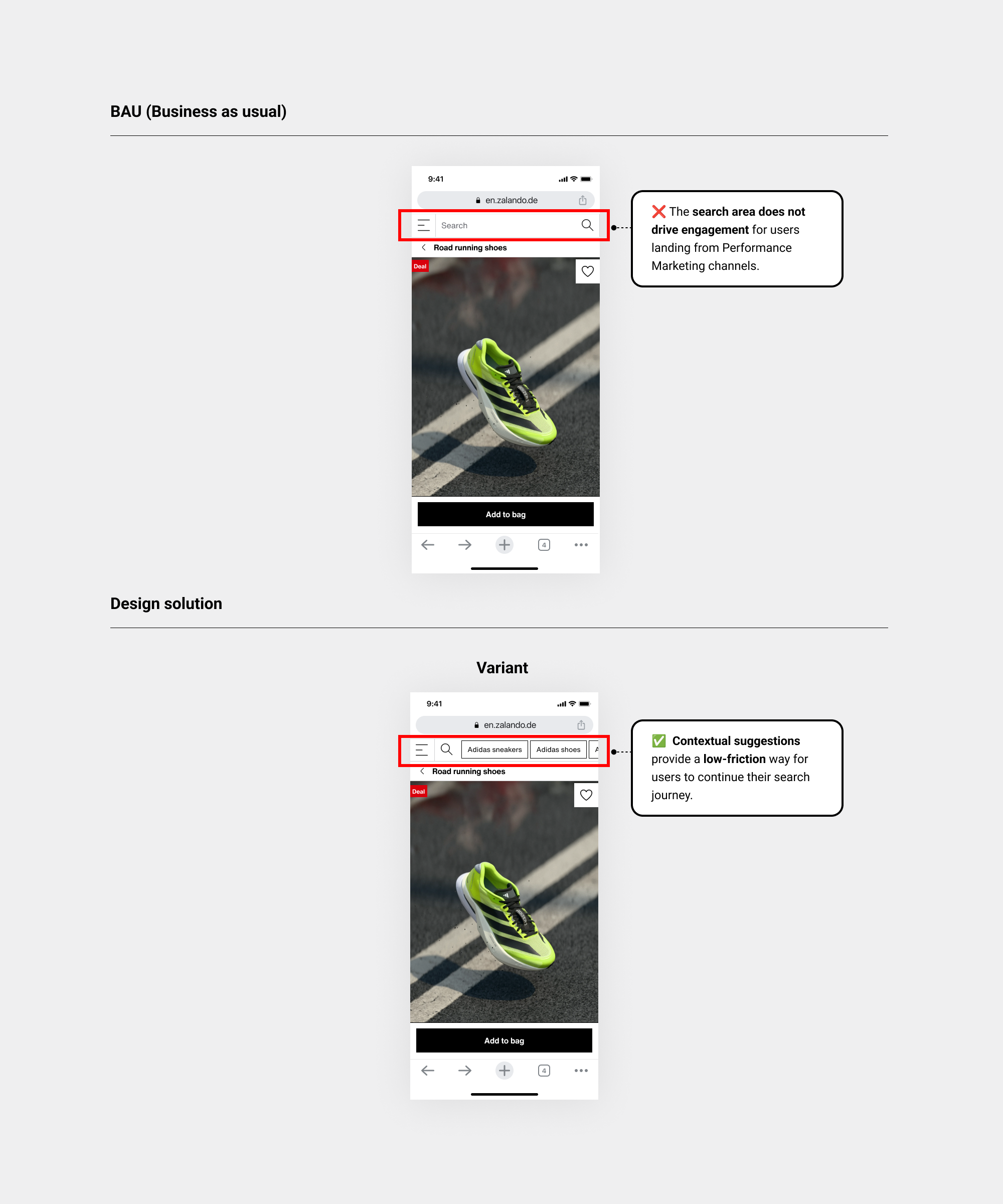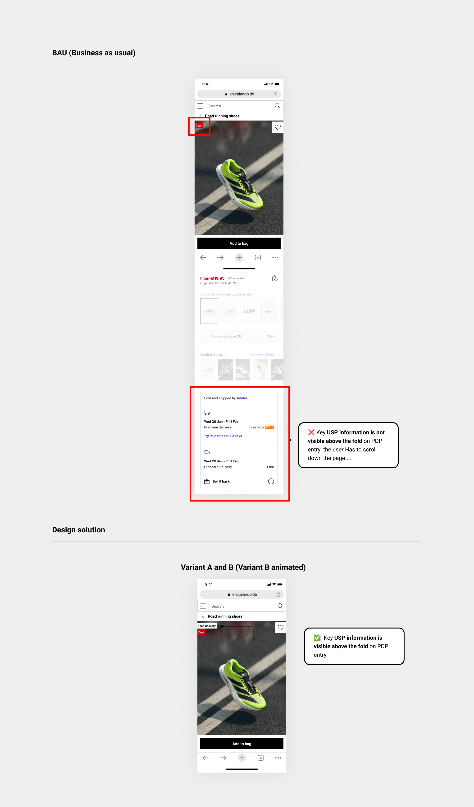 I optimised the PDP as a system, assessing scalable solutions for Performance Marketing and their potential to scale to the wider Zalando audience.