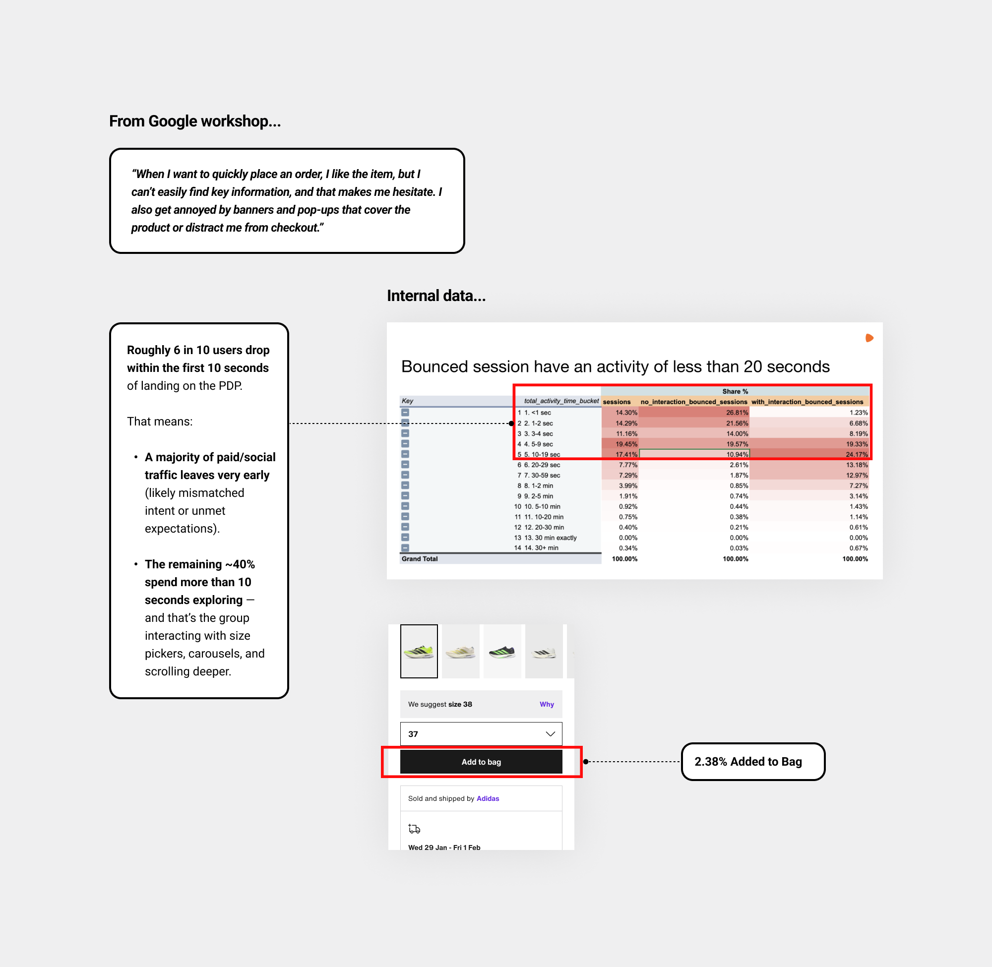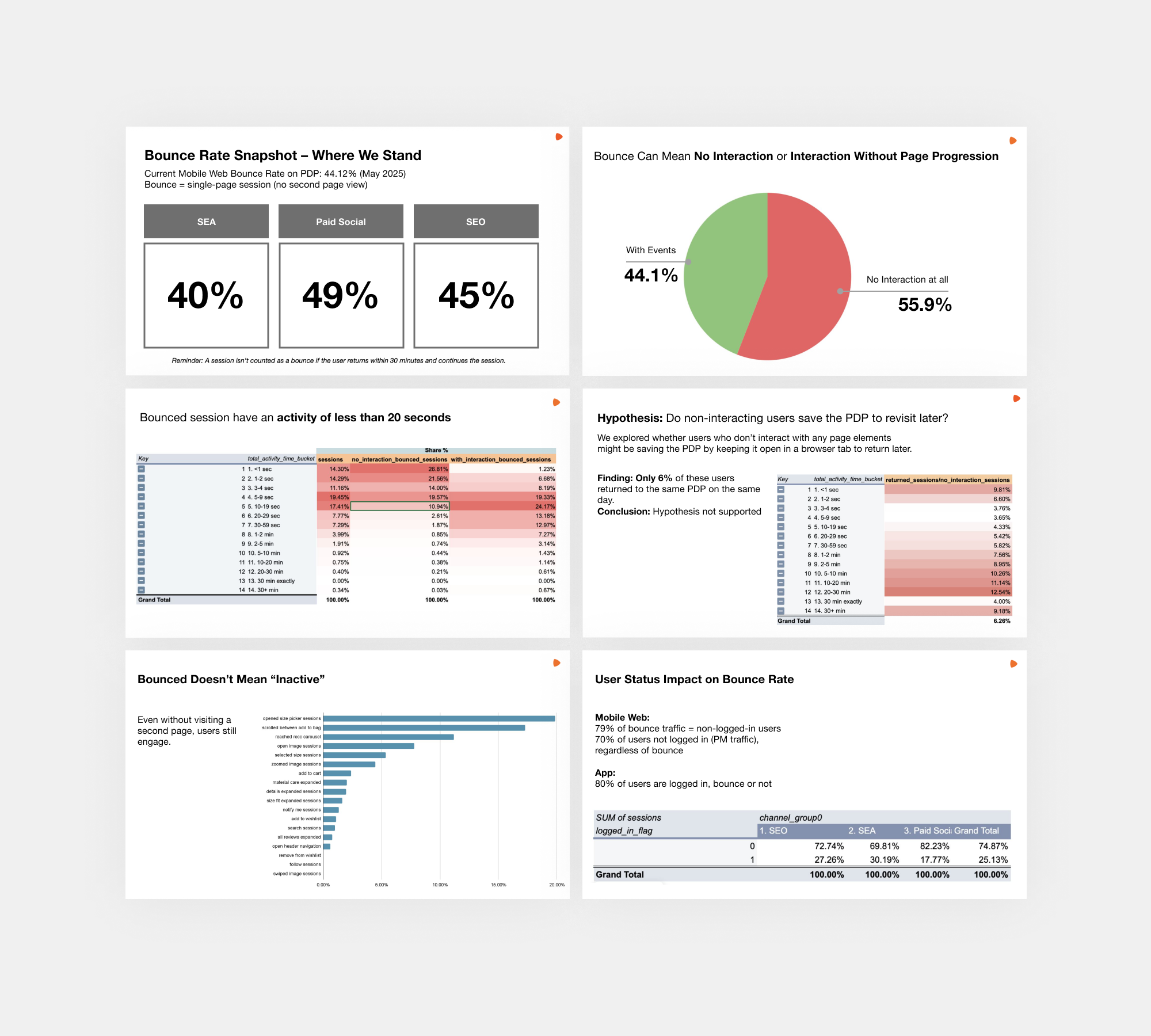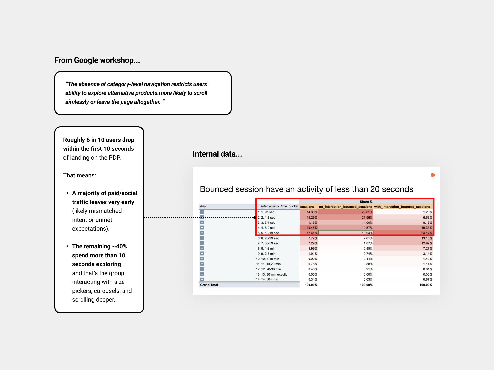Insights: Research and analytics show high bounce rates, repeated return to Google/Meta, and friction in discovery flows — indicating that current PDP page often fail to meet intent quickly or support confident product exploration, resulting in drop-off before conversion.