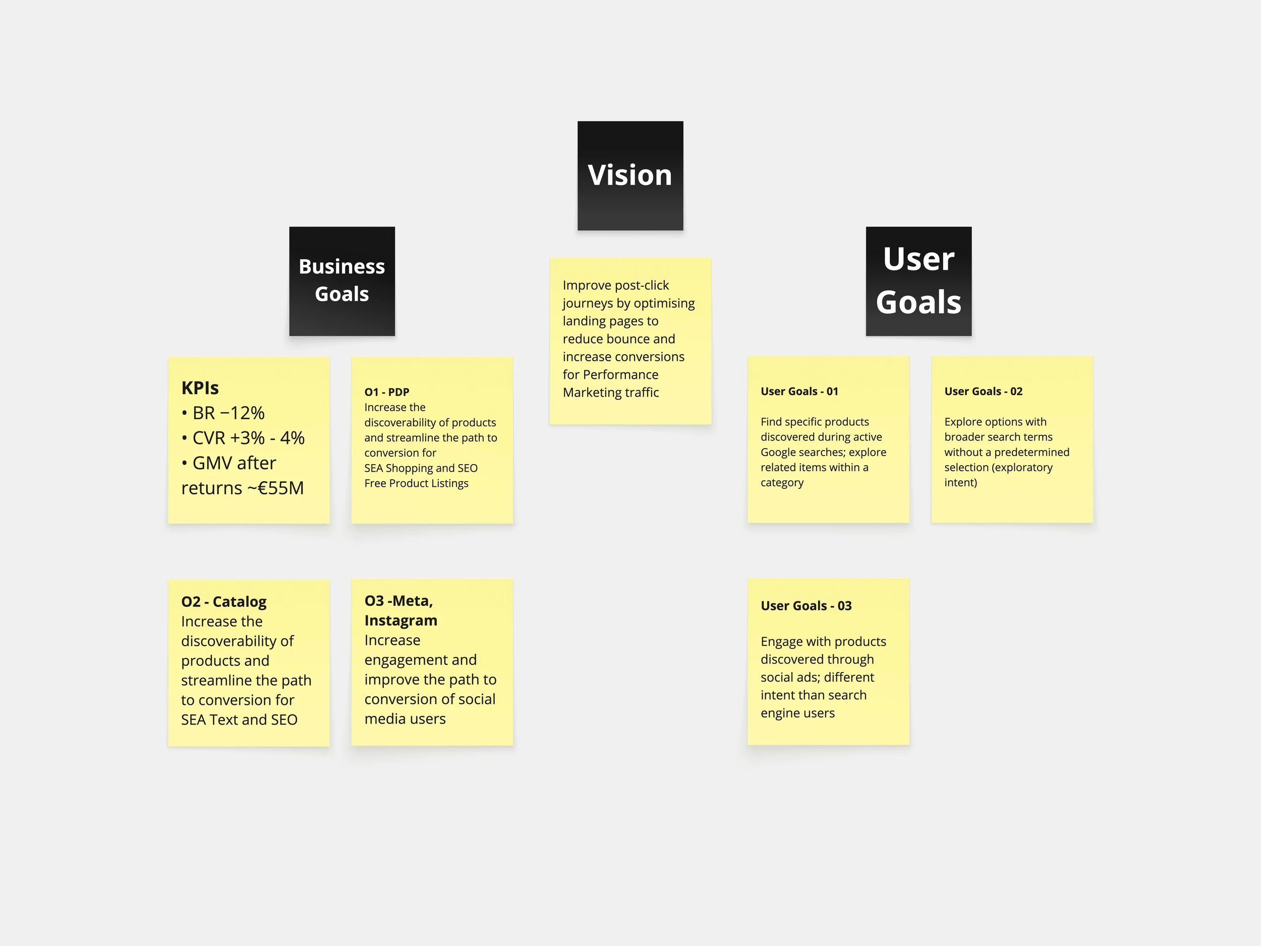 Then, simplified everything into two pivotal problem for the PDP landing experience for users arriving from SEA. As a team, we focused on O1(PDP), holding O3 (Meta/facebook) until we could evaluate the results from O1.