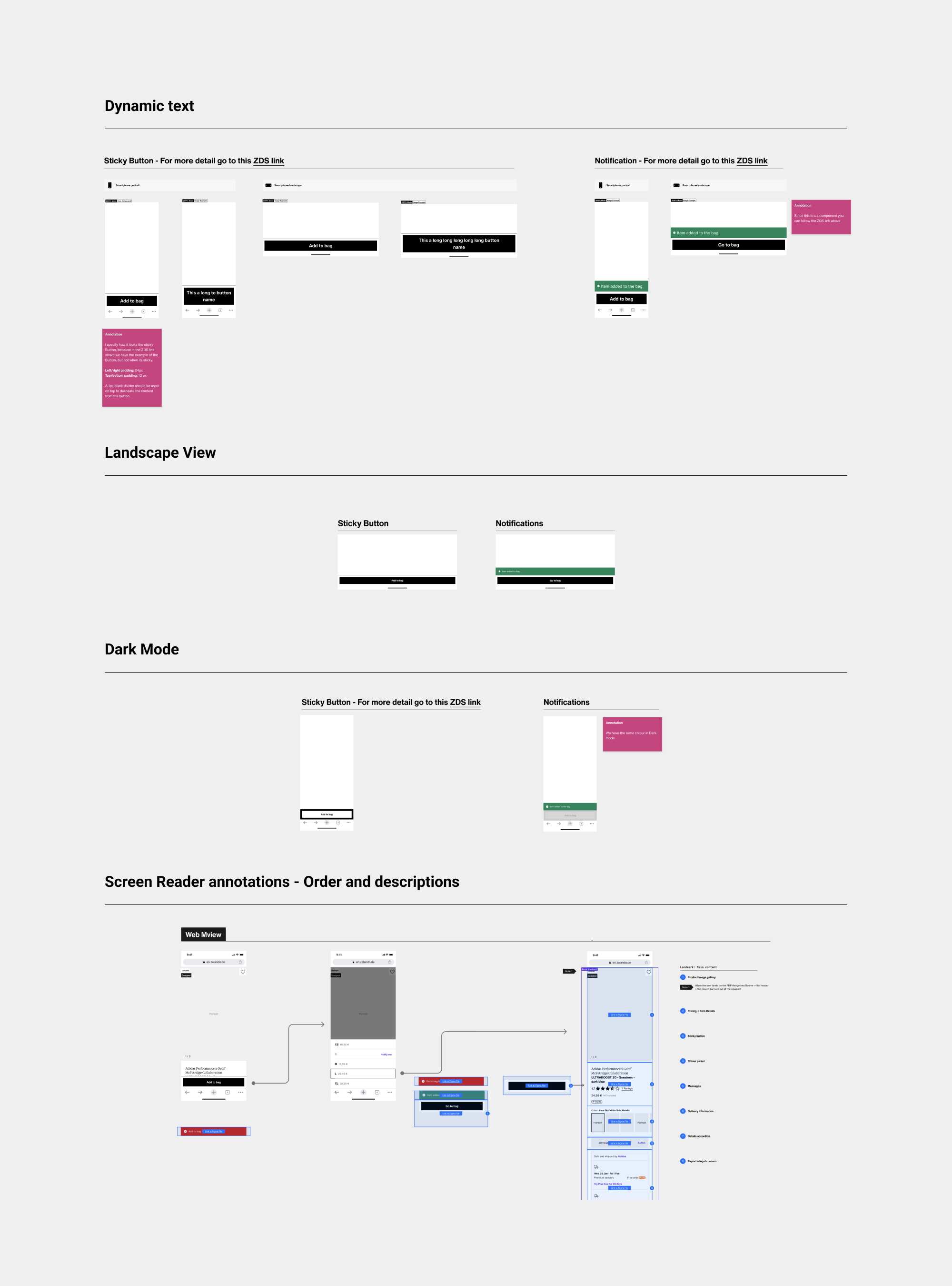 • A11y documentation: Dark mode, Landscape view, 200 % Dynamic text, Screenreader annotations.