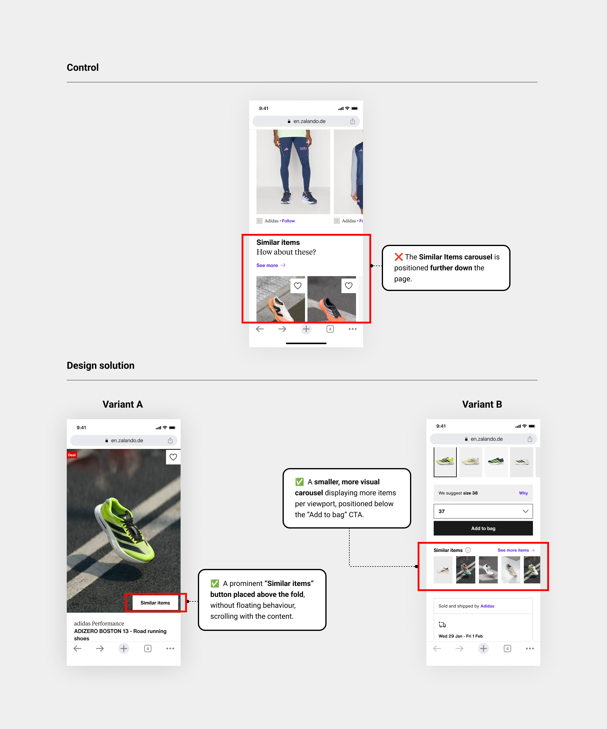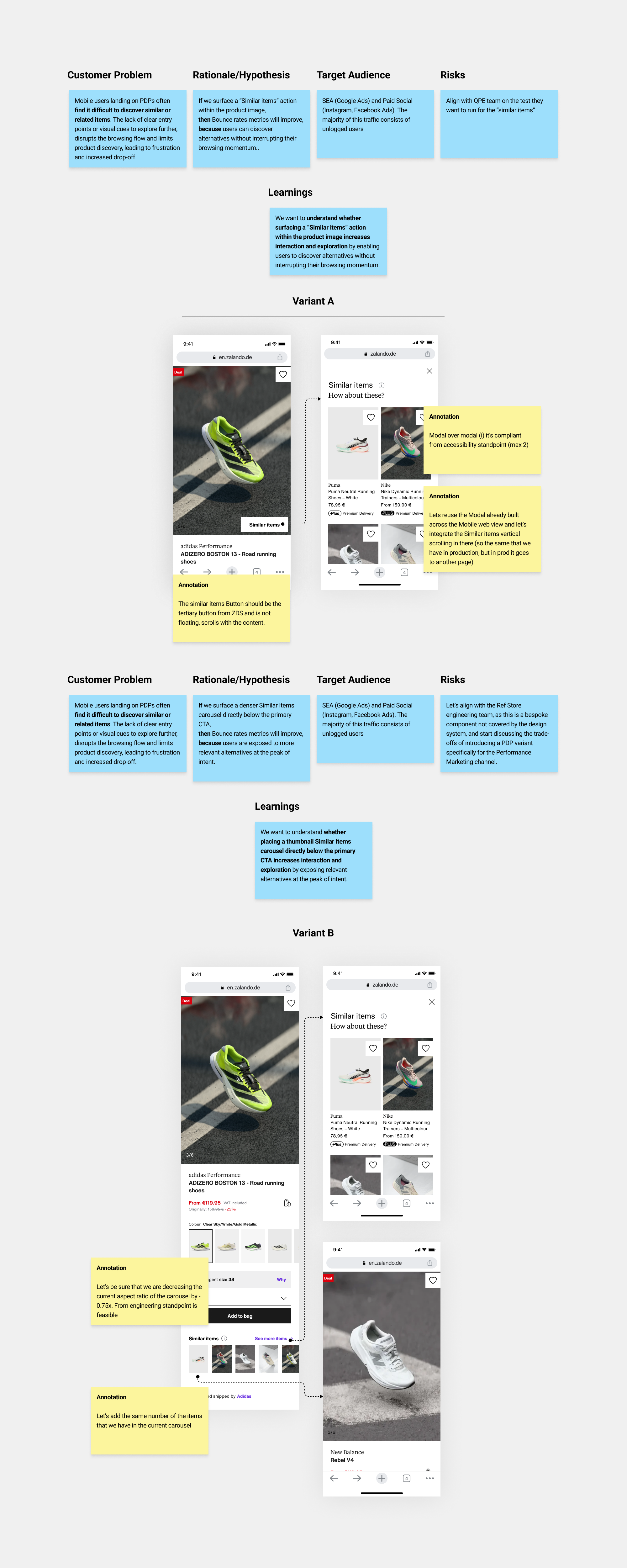 In the second iteration, I explored Variant A by placing a “Similar items” button above the fold to increase visibility and Variant B.