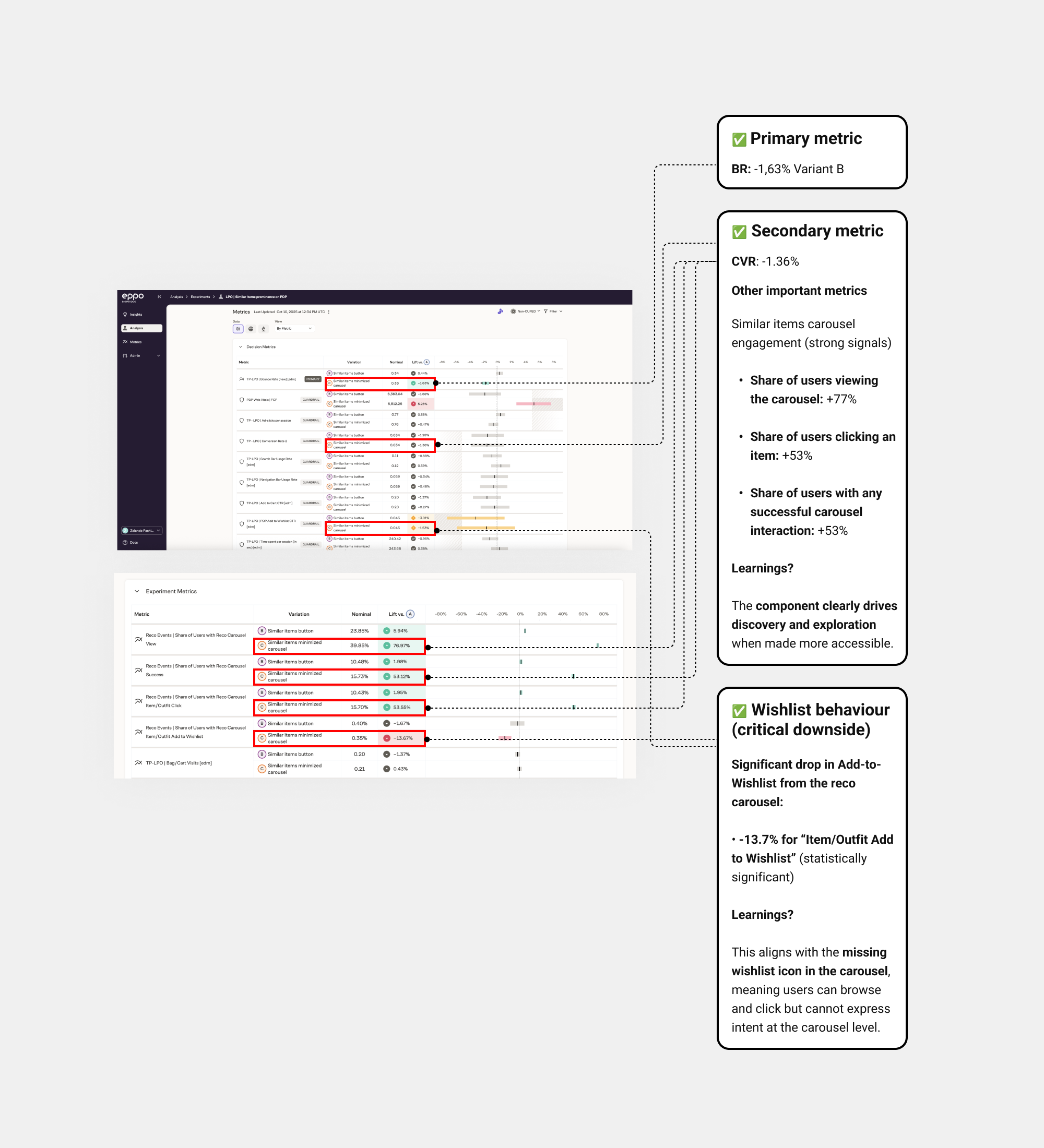 Variant B performed better, confirming that a a more visual Similar Items outperforms a text button entry point..