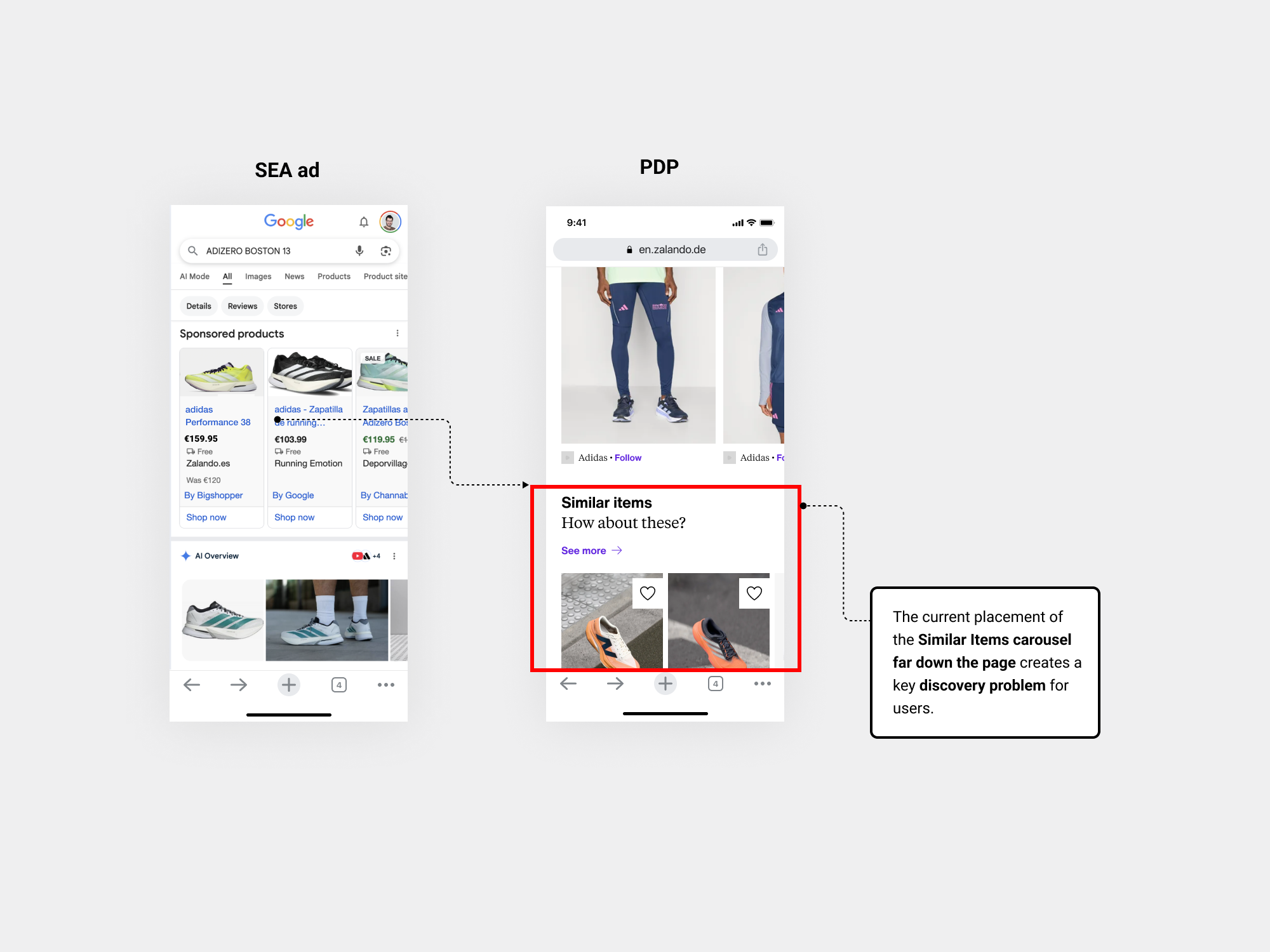 Through idea generation sessions in Figma Make and a Google workshop, we aligned on exploring how “Similar Items” could be leveraged to create greater impact.