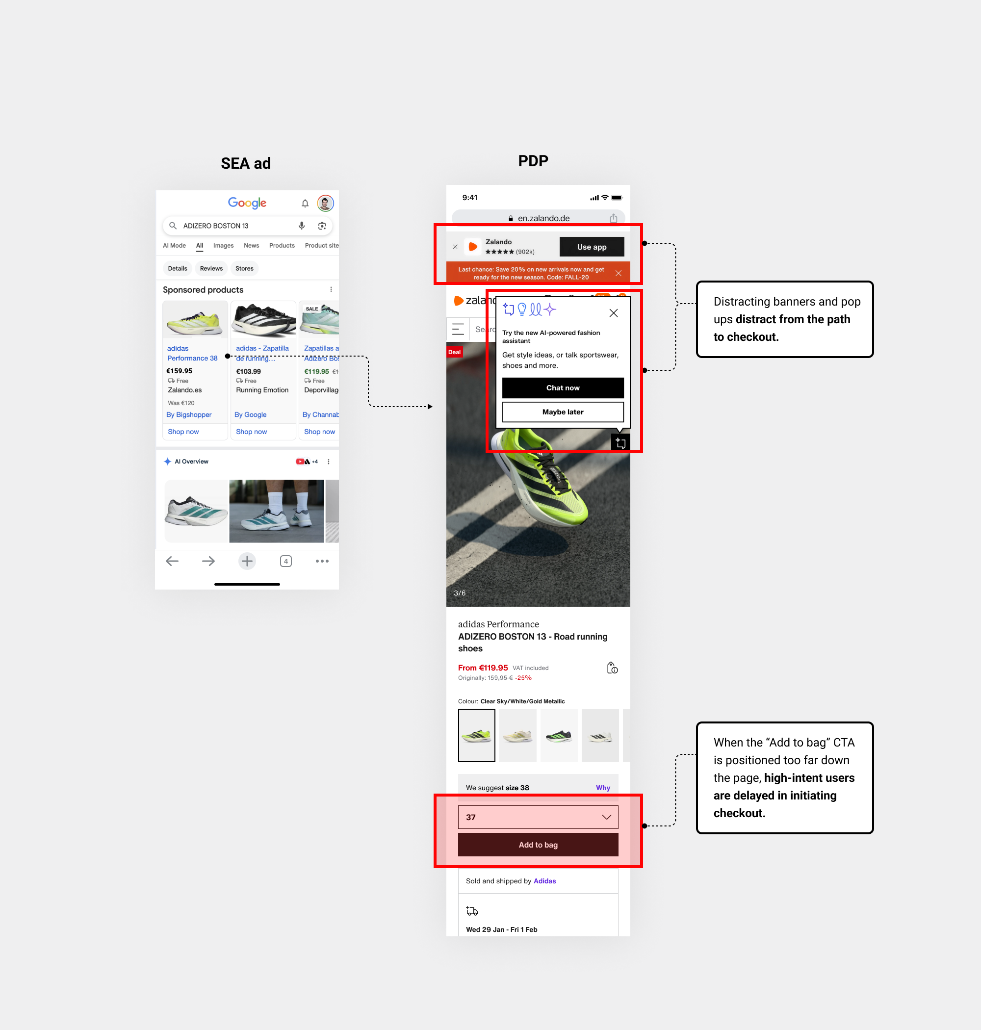 When viewing a specific product, users struggle to quickly access key information, while banners and pop-ups distract from the path to checkout, causing hesitation.