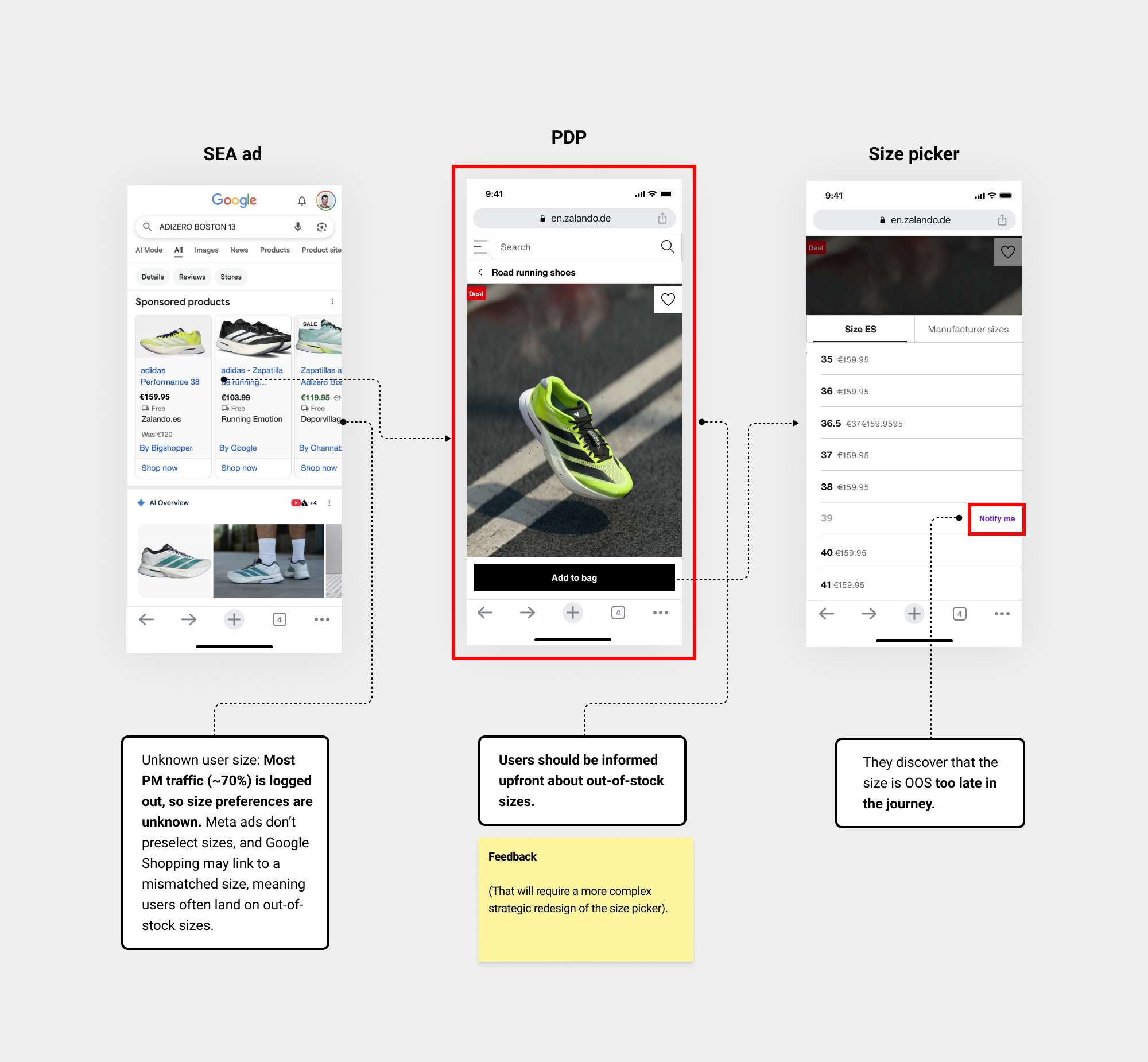 A key hypothesis from the Meta and internal workshops was that redesigning the size picker could be a strategic lever, as size availability wasn’t visible upfront.
