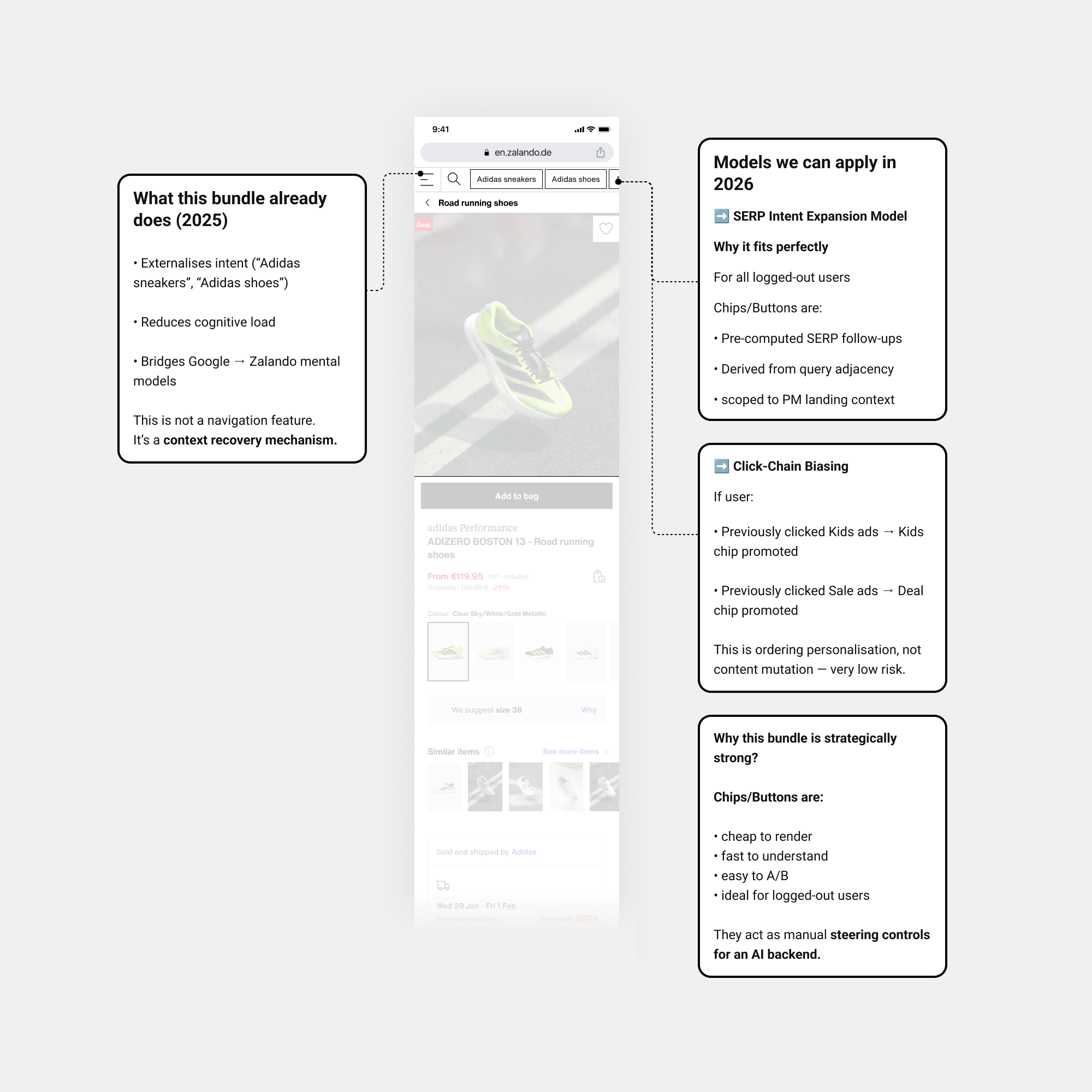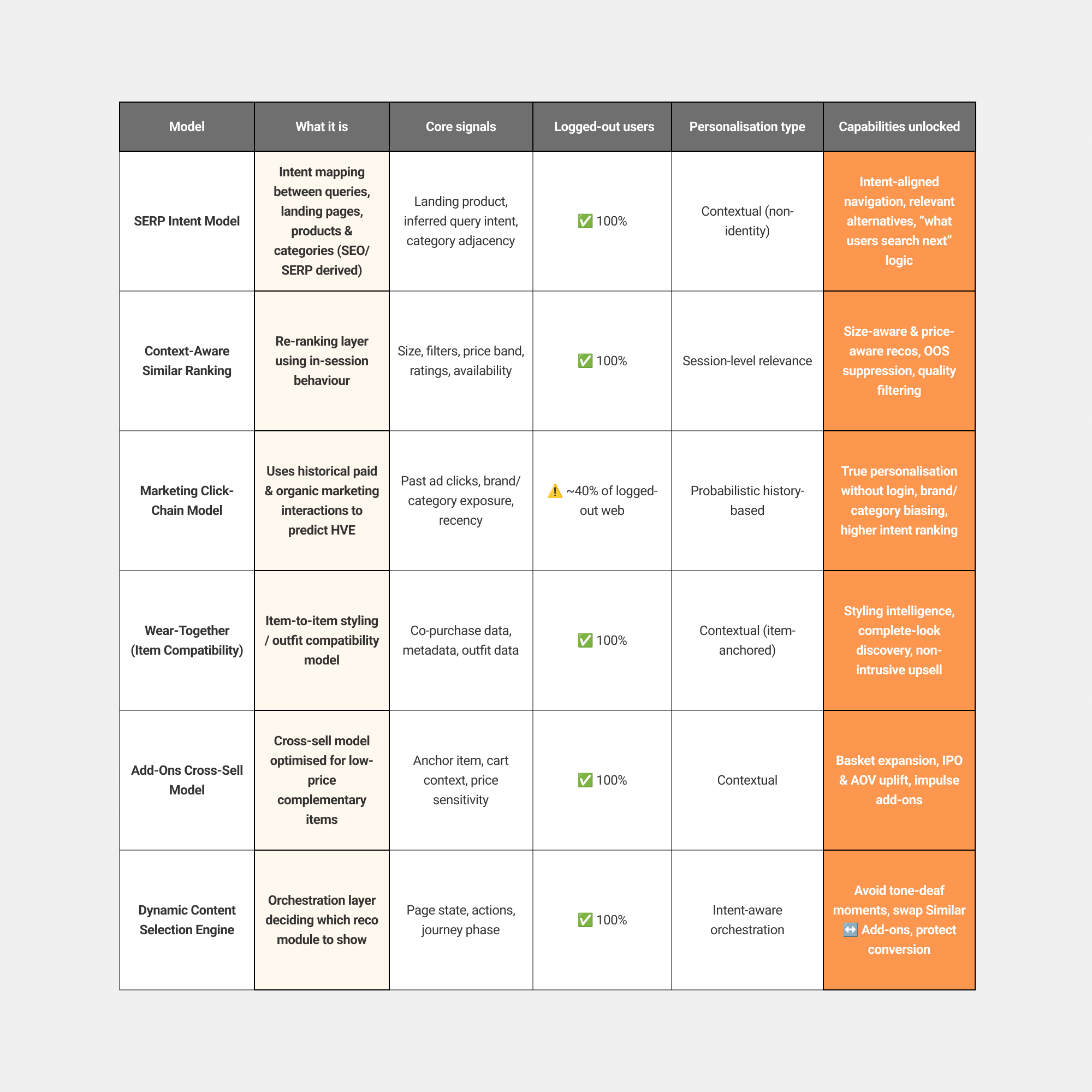 To ensure the PDP could scale beyond short-term optimisation in 2026, I mapped the capabilities of the underlying personalisation models—distinguishing between session-level intent, history-based signals, and what works reliably for logged-out PM users.