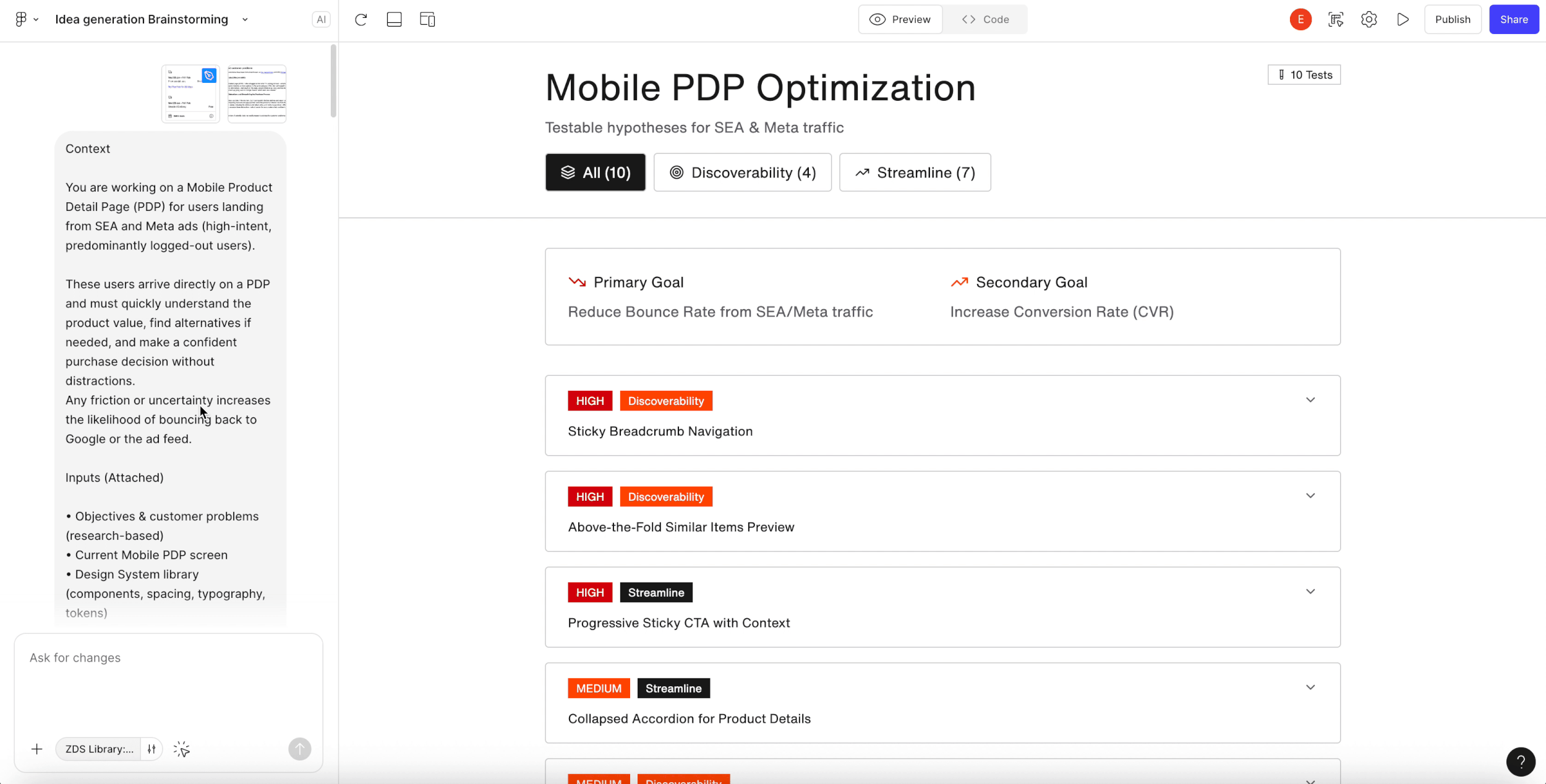 After the Meta workshop, I co-led an internal session with the PM to translate insights from Meta’s user testing into testable hypotheses. We brought the full LPO team together to align on these insights and start building a shared backlog of ideas.