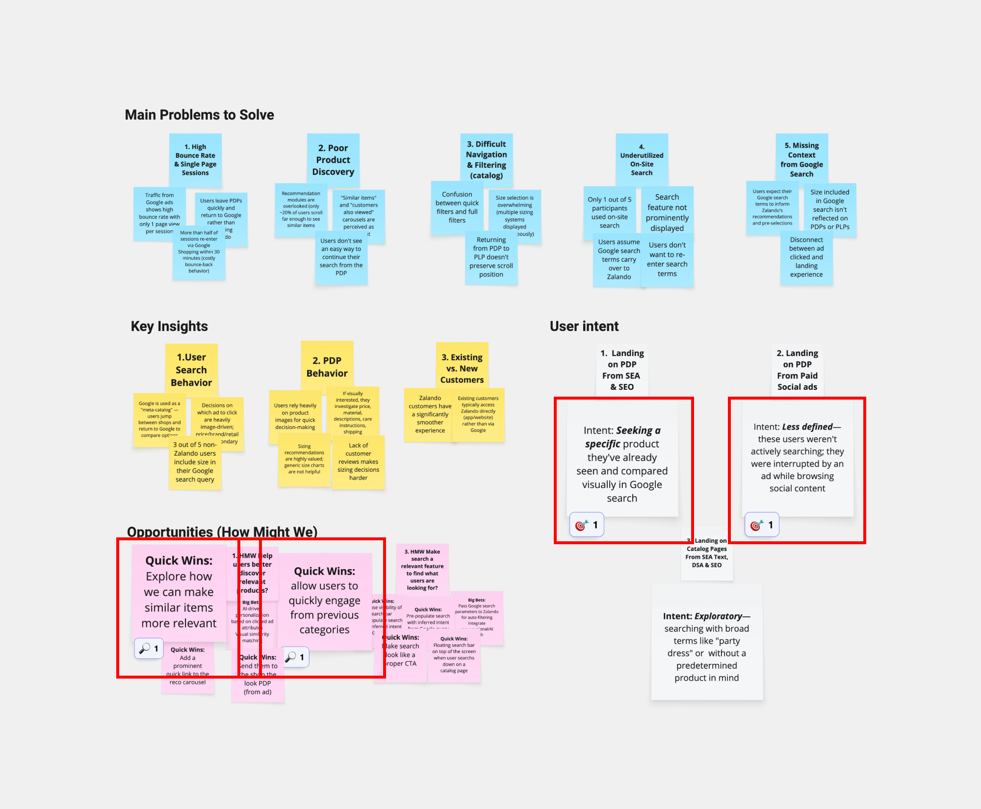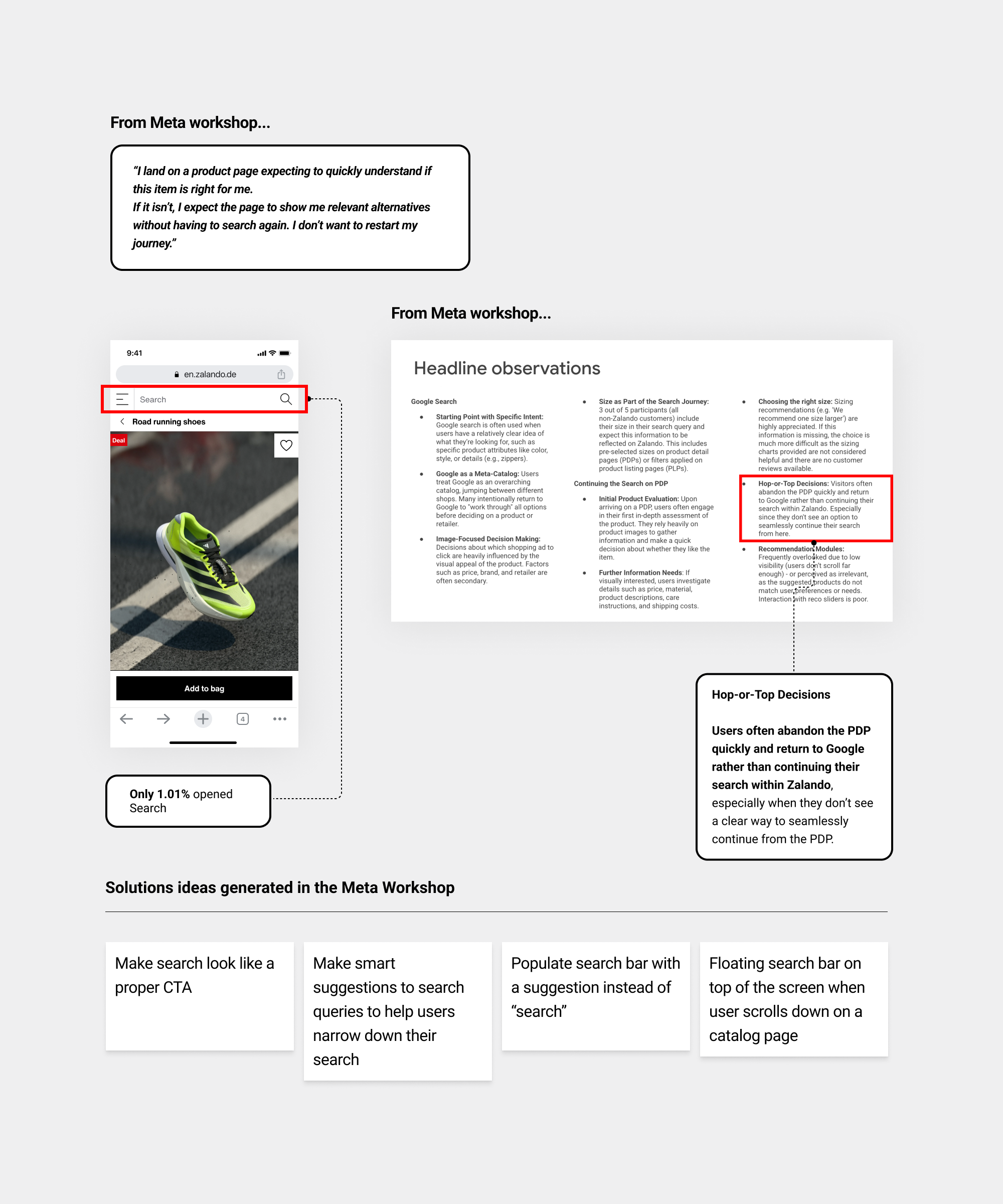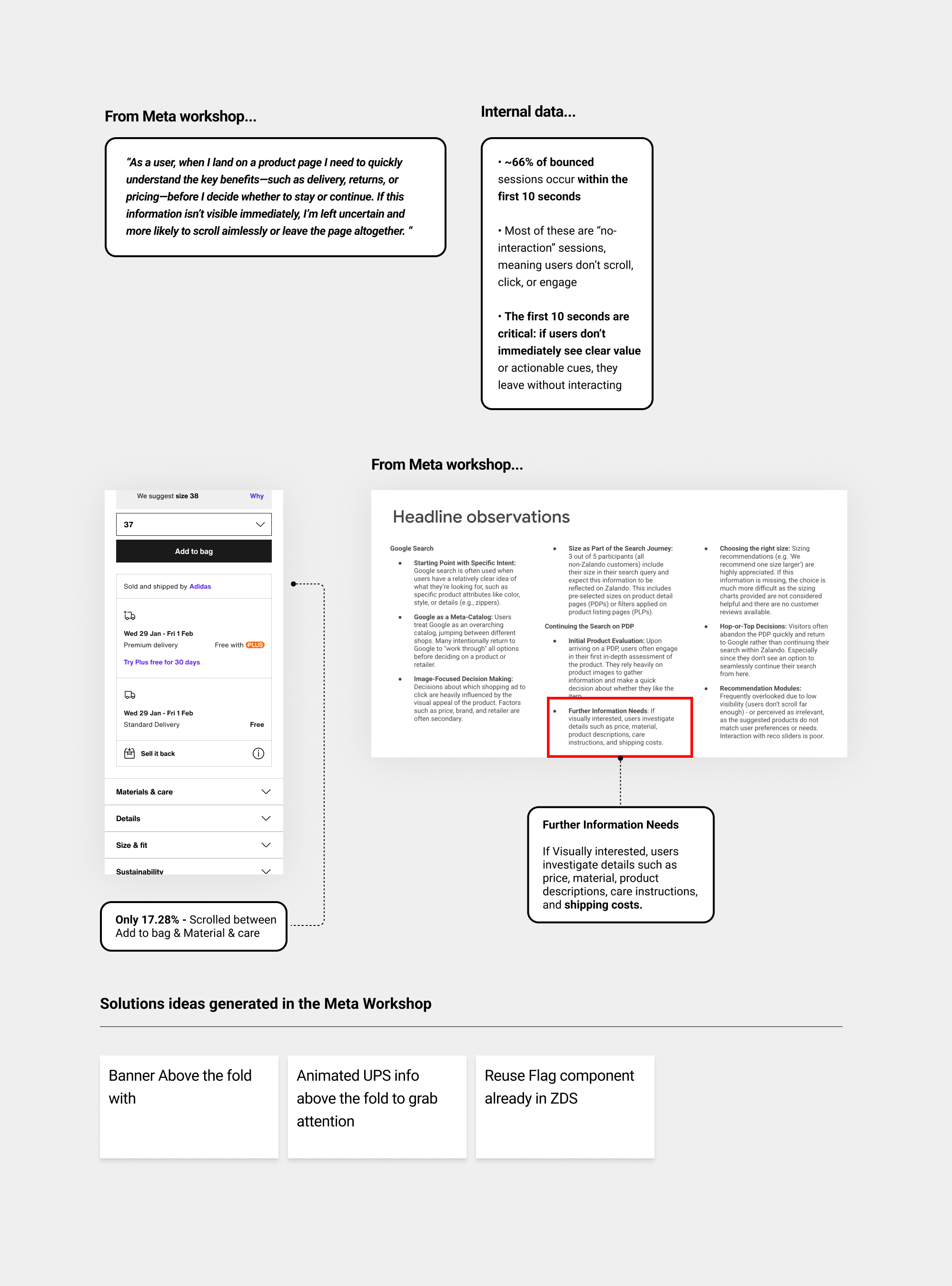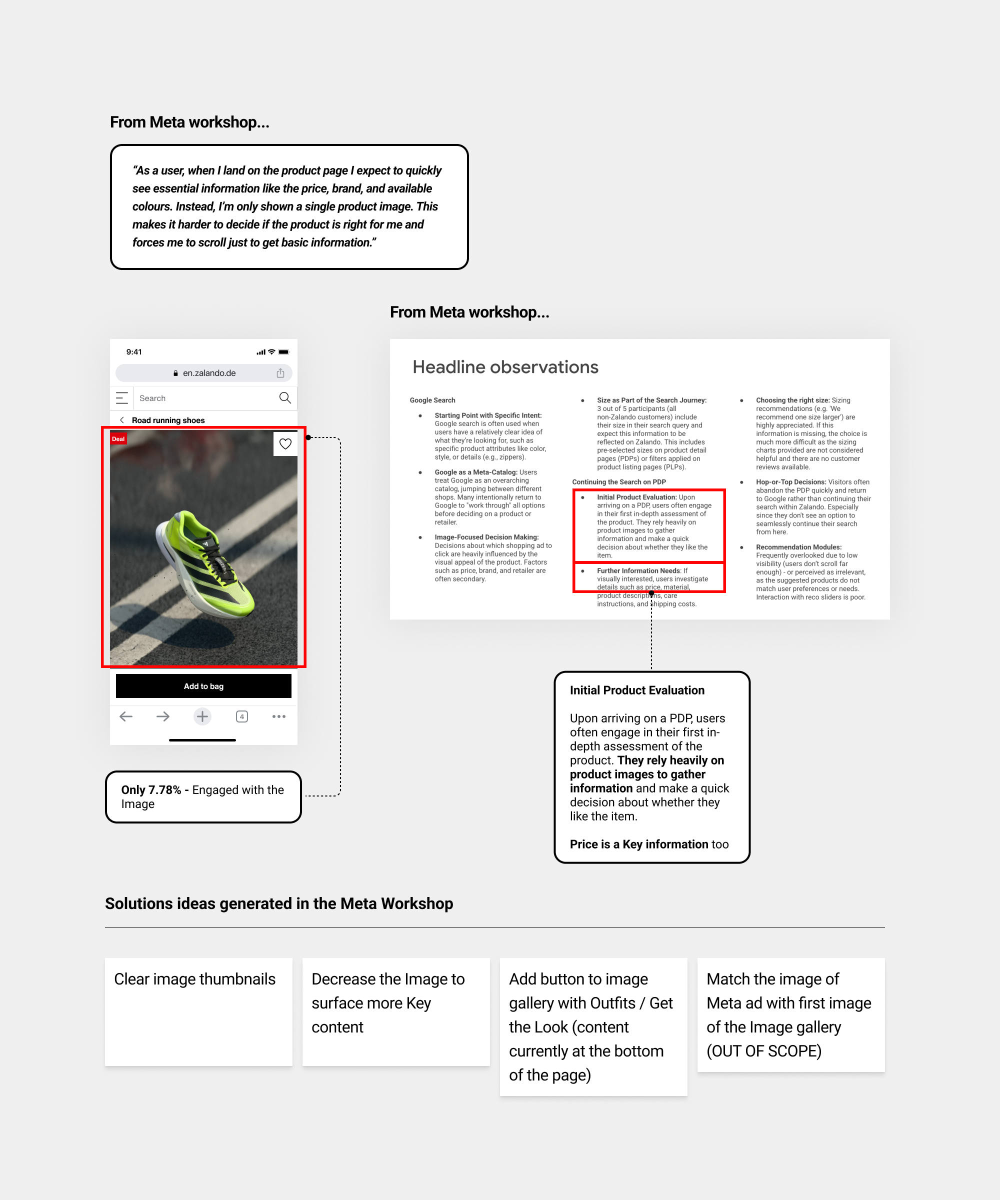 We already had solid research from Google’s mobile lab and prior interviews. I focused on extracting key insights—understanding user intent when landing on the PDP and identifying the main problems. Some proposals emerged from this workshop, but I re-evaluated them when I joined the company.