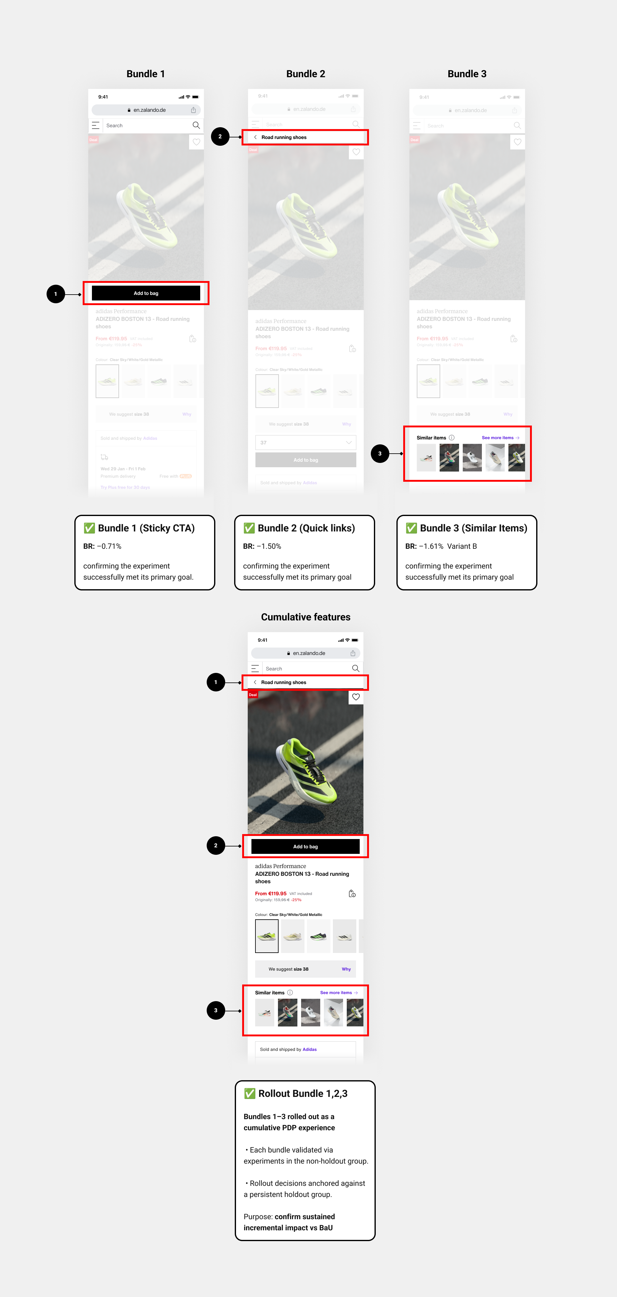 In Bundles 1-3 we reduced bounce rate by deliberately removing distracting elements on PDPs. As part of the rollout conditions, a follow-up confirmatory test was required to: