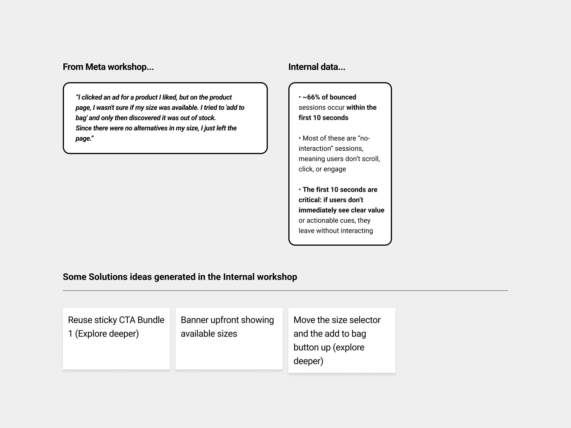 While two key opportunities from Meta’s workshop—handling “Size Not Available” and improving USP communication—anchored the discussion, we also explored additional ideas informed by the broader set of user tests conducted by Meta.