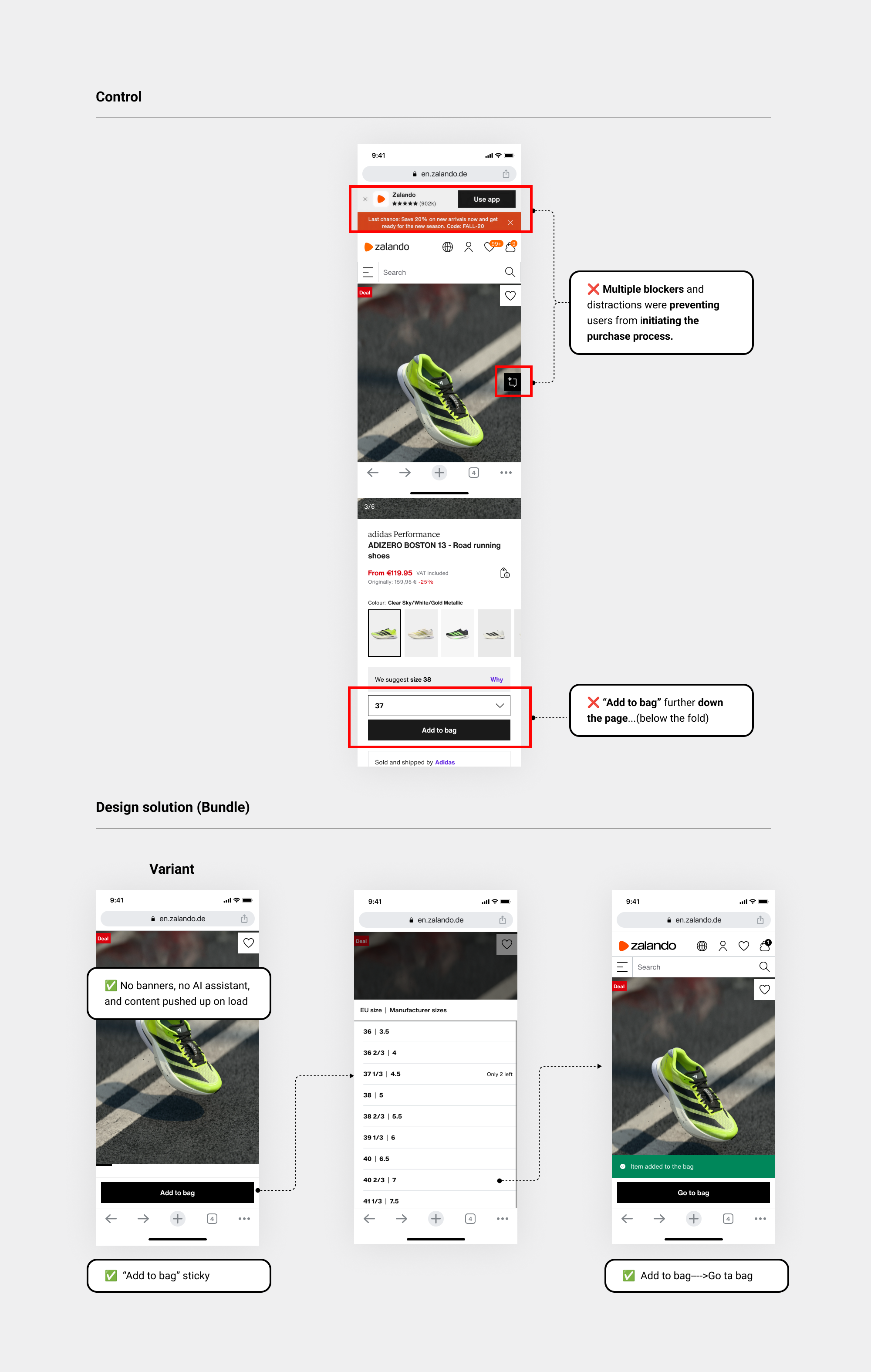 So after several iterations I arrived at a more tactical solution to anticipate size availability. Variant B became an iteration of Bundle 1, allowing us to keep the scope simple and focus on validating the core test objective and learnings.