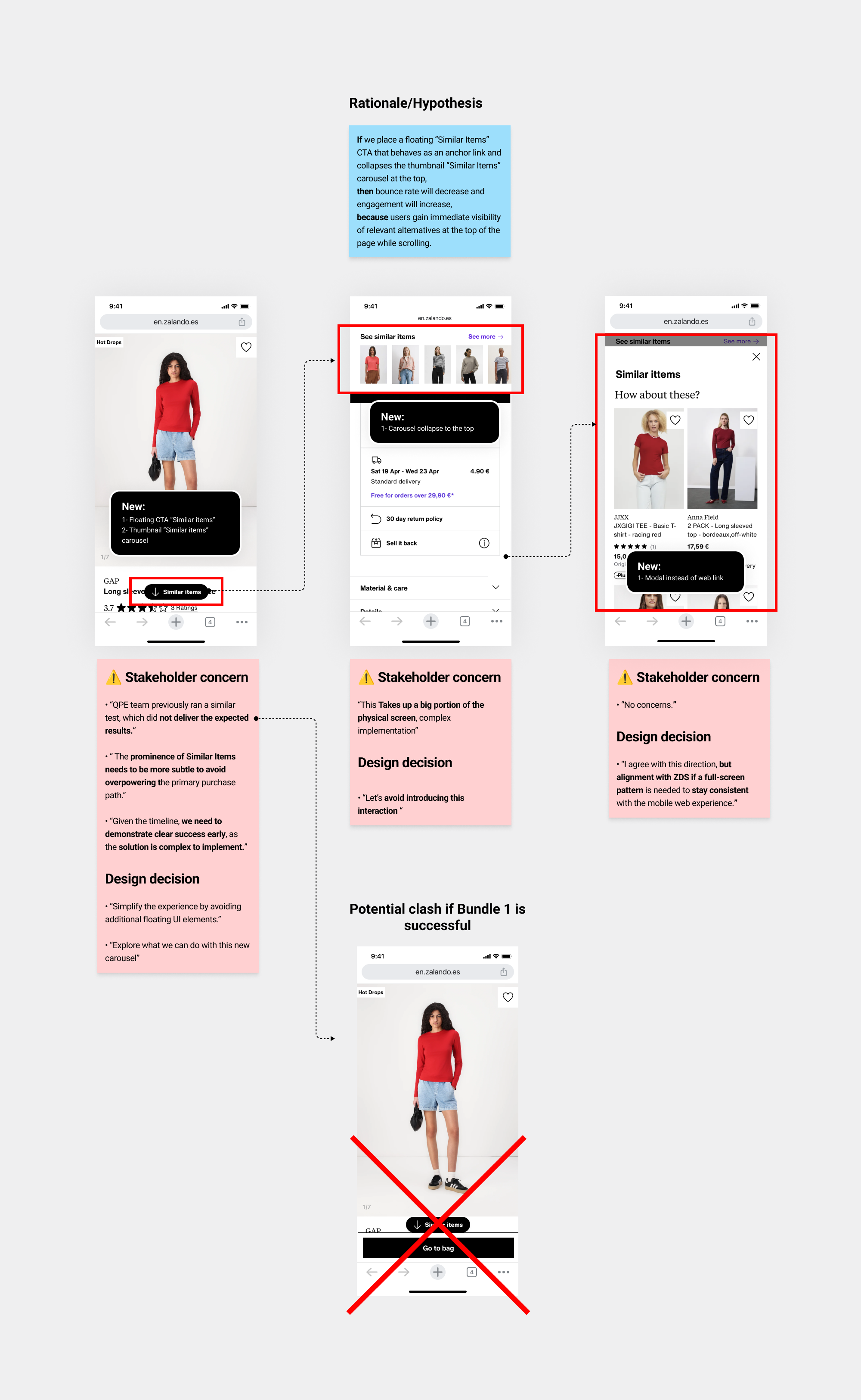 Based on the feedback, we aligned that a new thumbnail “Similar Items” carousel was a strong component to pursue. We then focused on clarifying the design thinking behind the iteration approach...