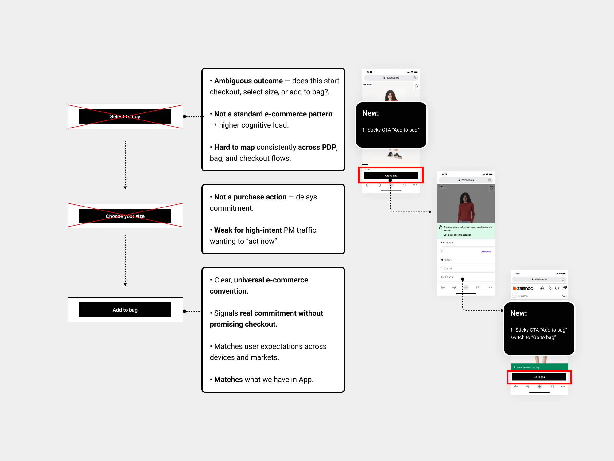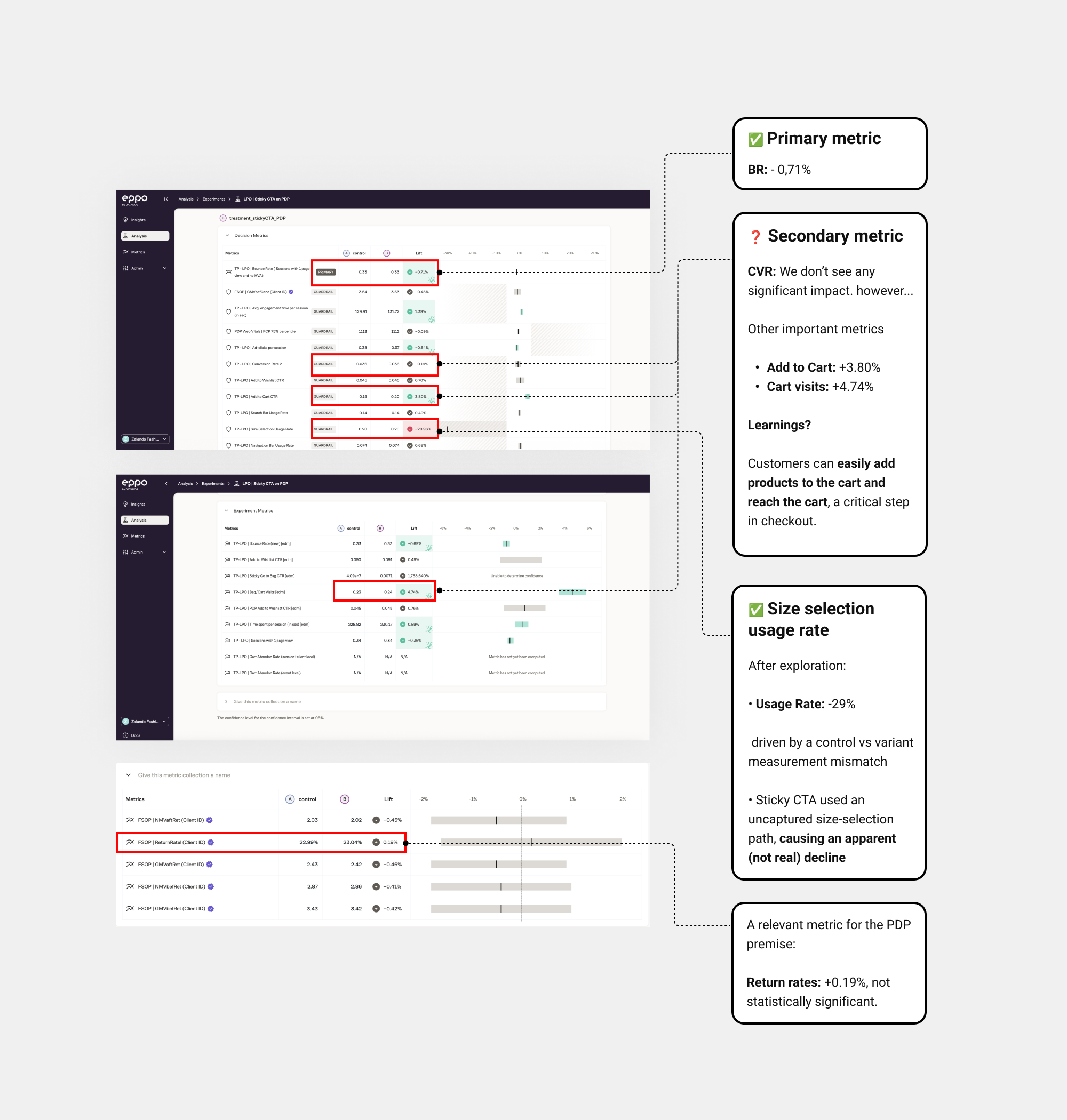 A sticky Add-to-Bag CTA that opens the size picker helps users move faster into the purchase flow by making the primary action constantly accessible. Engagement improved and return rates showed no significant impact, validating rollout with GMV quality guardrails.