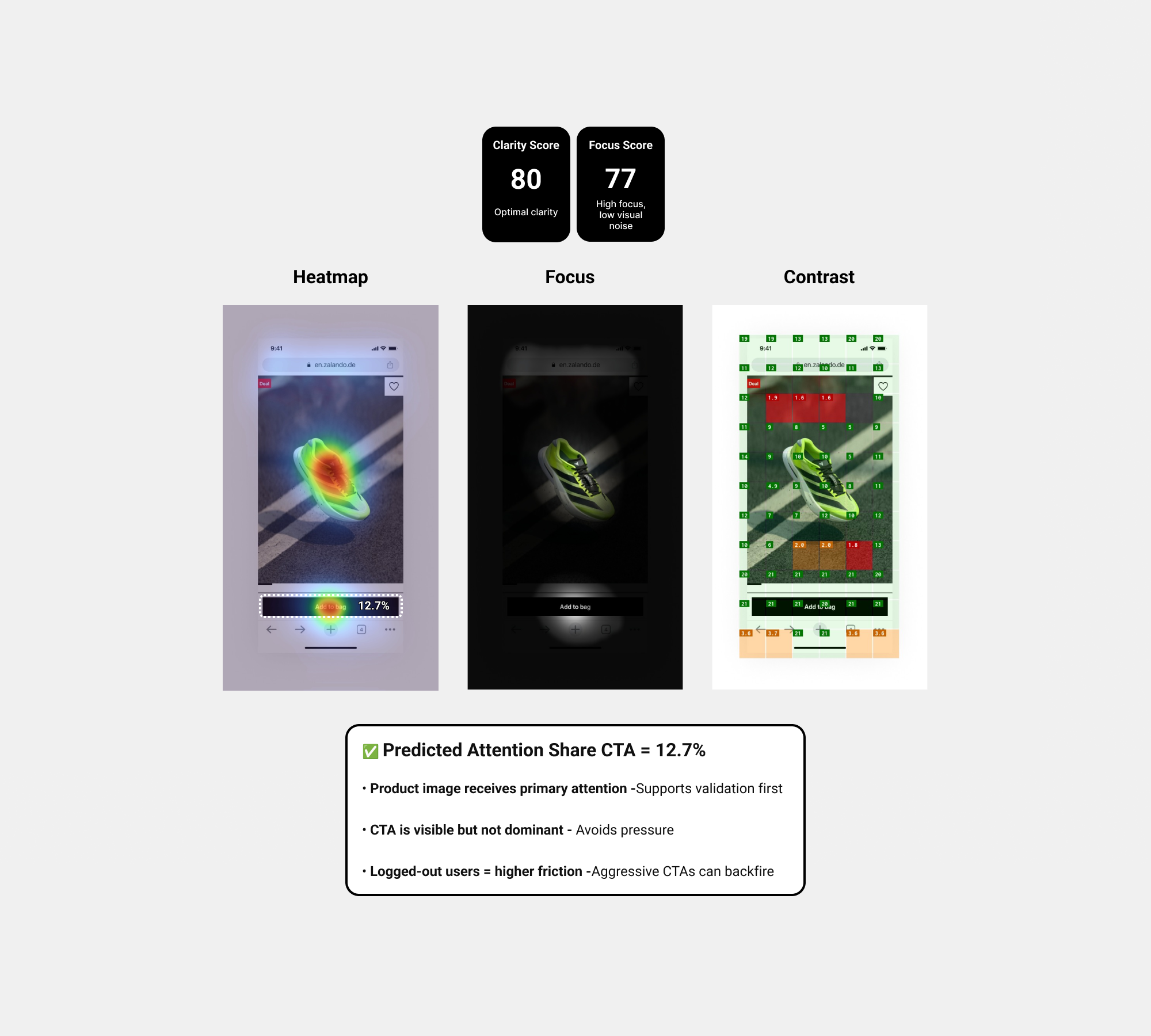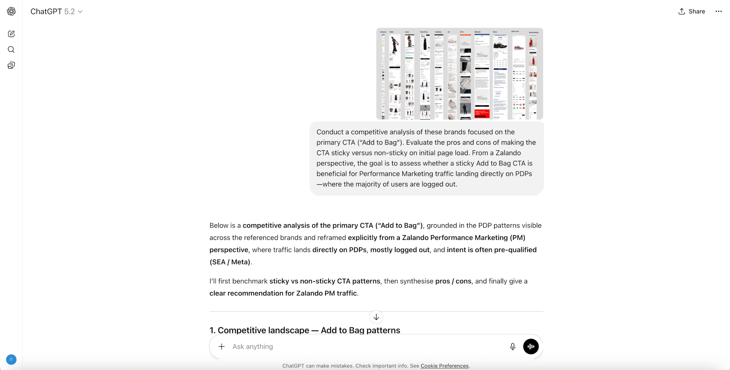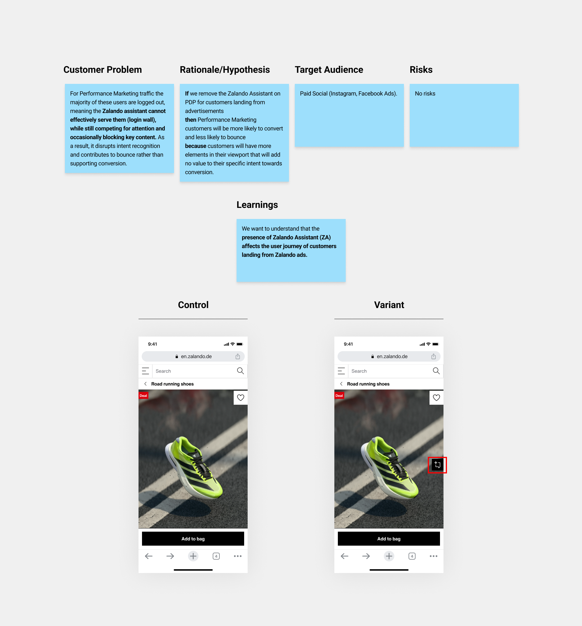 ➡ I challenged the PM to extend the KPI set beyond Add-to-Bag CTR to also include CTR on Quick Links, Search, and the Favourites icon, ensuring we could accurately assess how much other PDP elements were competing the Zalando Assistant.