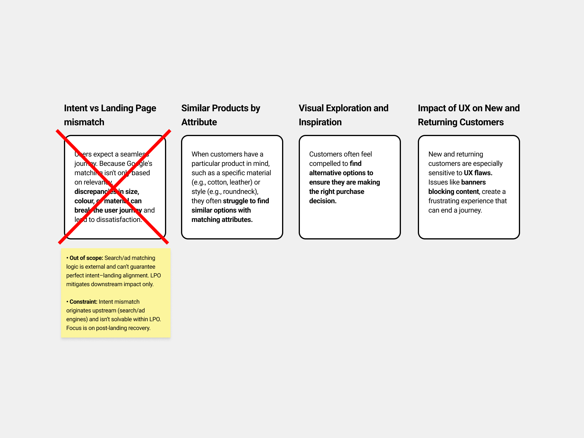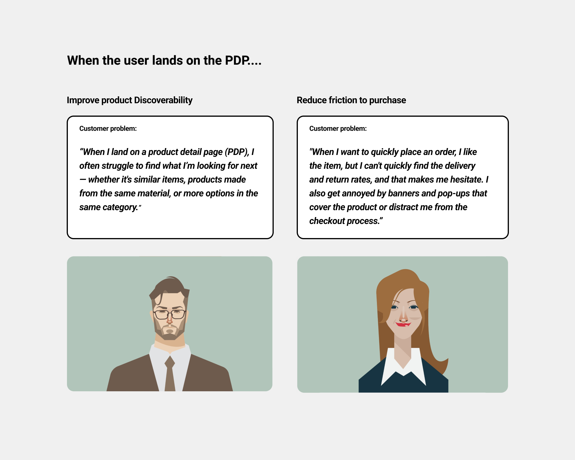 Needs: They need landing experiences that match their search intent, surface similar alternatives effortlessly, provide enough information to evaluate options, and minimise friction when continuing the journey or deciding to buy.