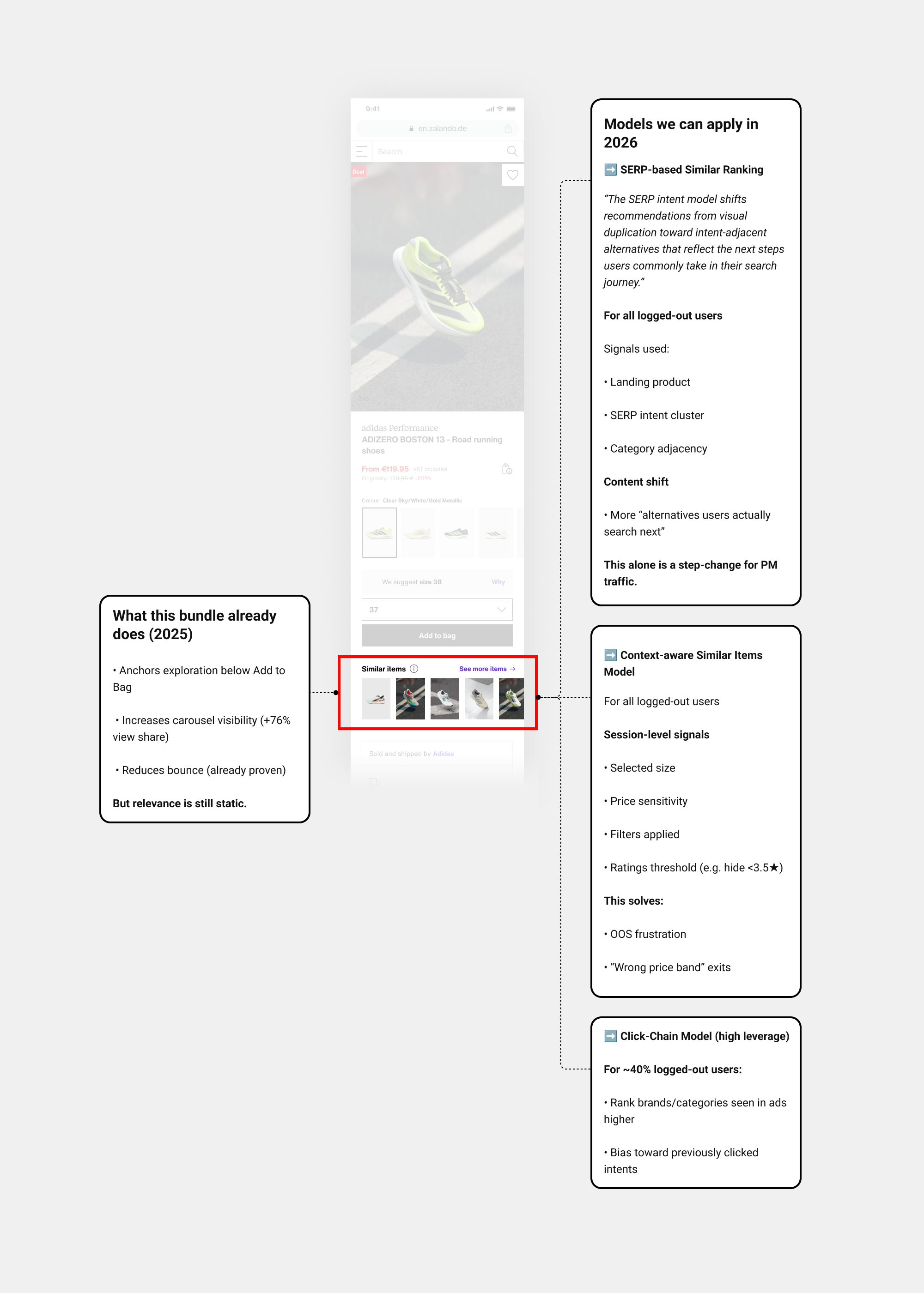 I designed the Similar Items thumbnail carousel as a system-level architecture, enabling the strategic rollout of personalisation models planned for 2026 and how we can anticipate from user actions. That’s exactly how we wanted scale learning without UX debt.