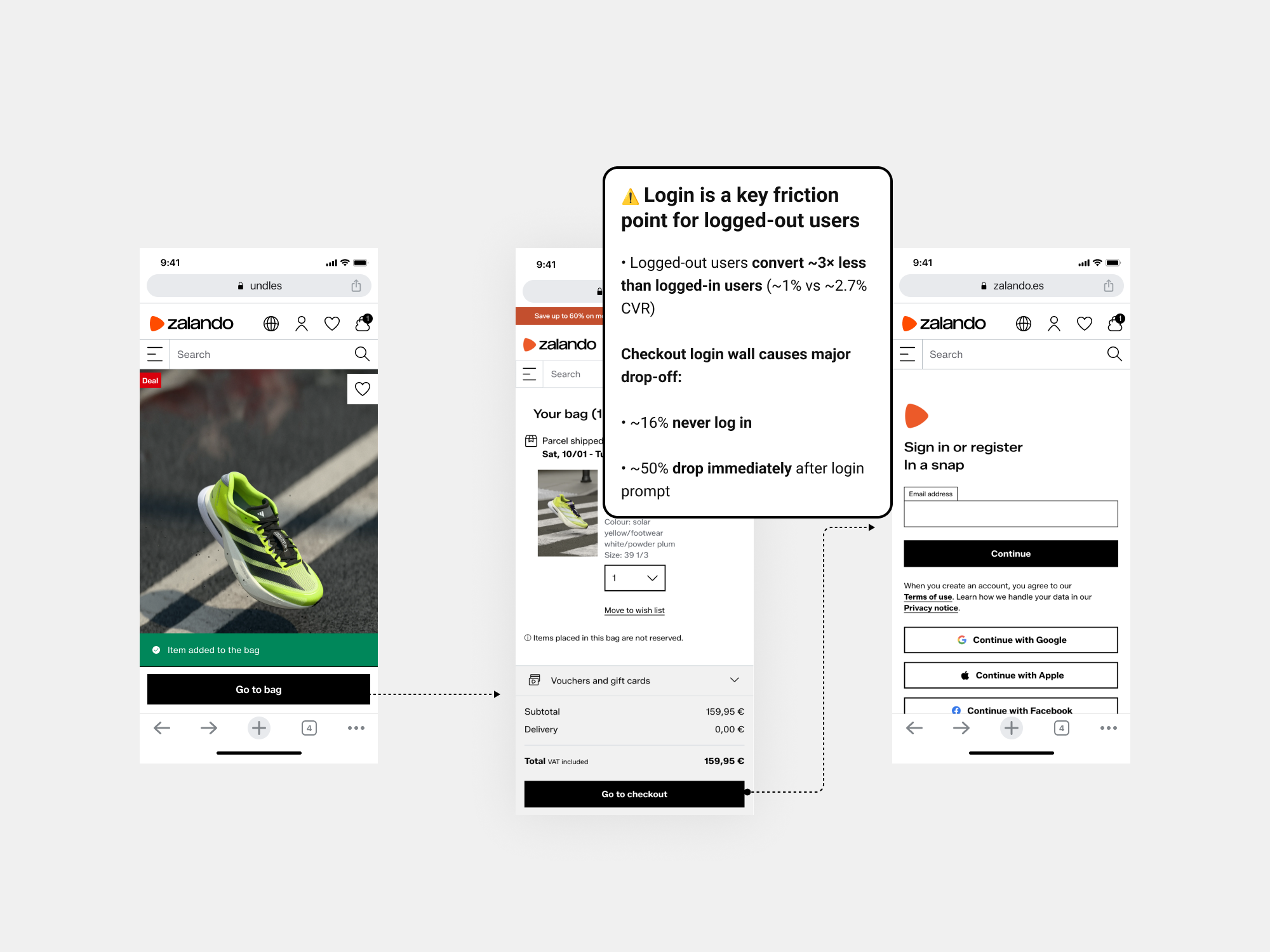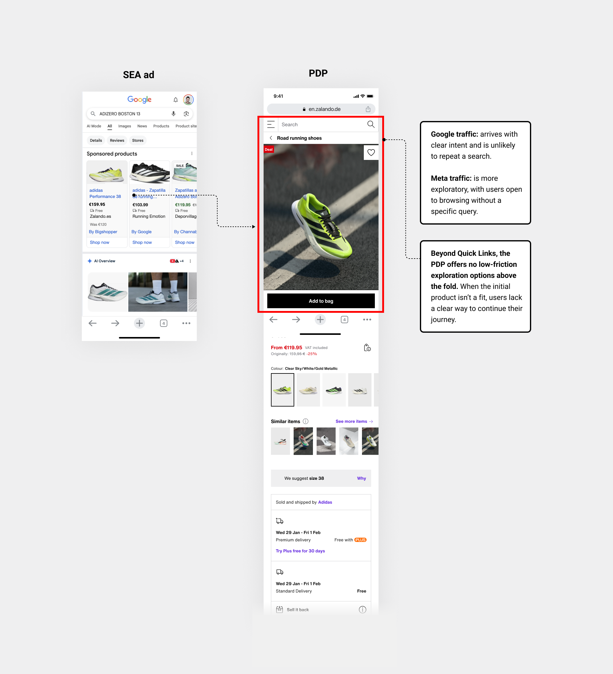 Zalando data revealed a misalignment at PDP and Catalog entry points: users arriving from Performance Marketing (Meta / SEA) and SEO often bounced immediately, with PDP bounce rates around 50% and Meta traffic exceeding 56%. Around half of PDP entry sessions came from Performance Marketing, with most users logged out and landing on pages that did not reflect their search intent.