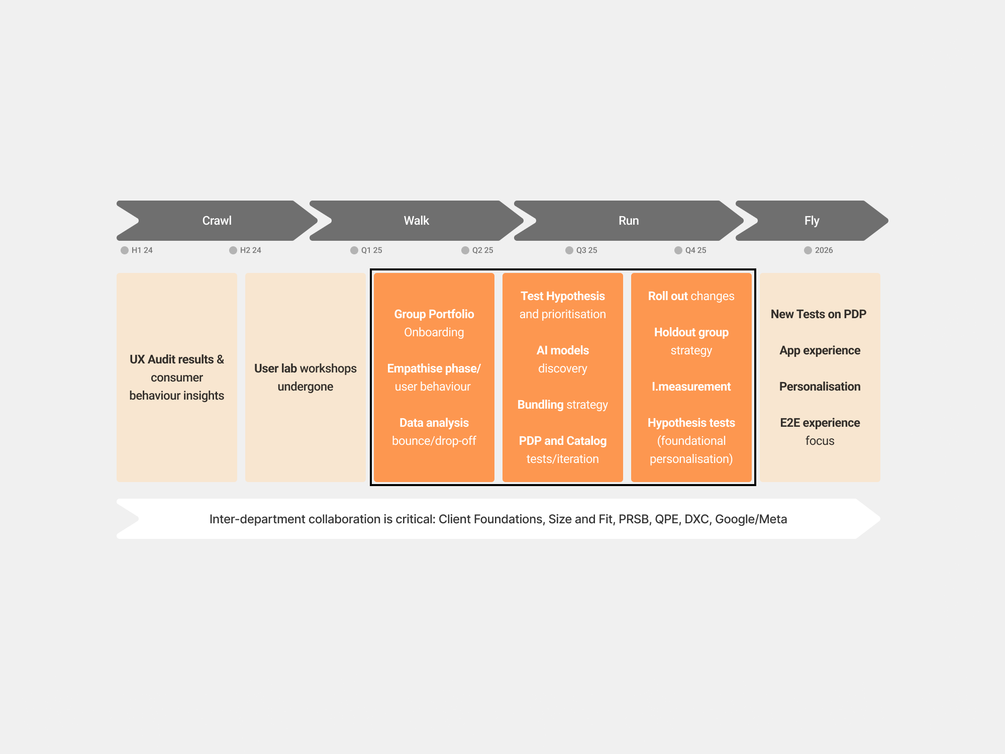 We had to re-prioritise along the way. After reviewing initial KPI estimates with Analytics, we recalibrated the end of 2026 goals to –8% BR, +4% CVR, and ~€45M GMV. Due to a potential cloaking risk, SEO traffic was excluded from experiments, which removed Catalog tests and shifted focus to PDP experiments using paid traffic only. Goals were recalculated accordingly.