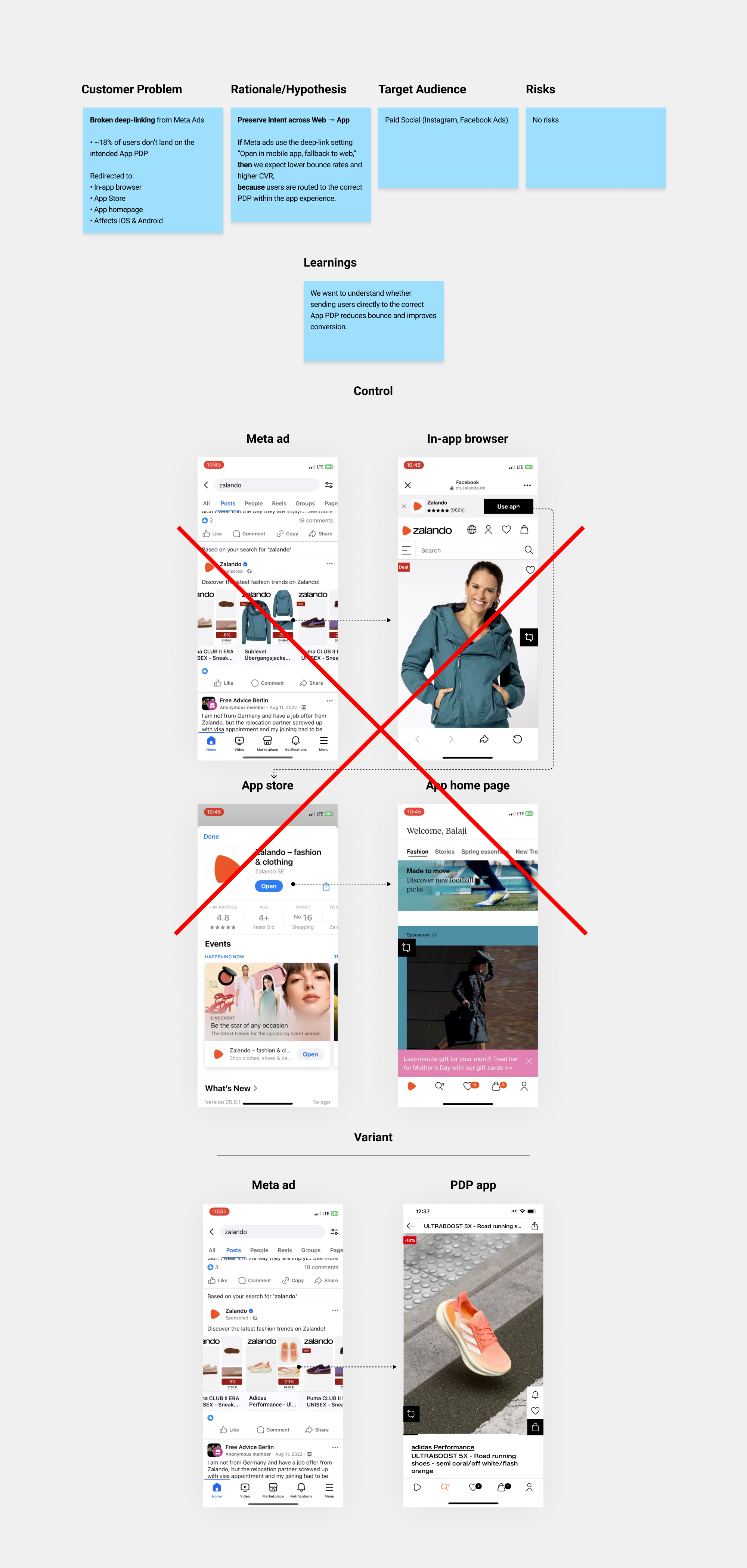 I led the bundle strategy and CRO experimentation at Zalando, applying a data-driven product design approach to reduce friction and improve conversion at scale for paid traffic landing on PDP (SEA and Meta) on mobile web, while laying the foundation for personalised design architecture in 2026.
